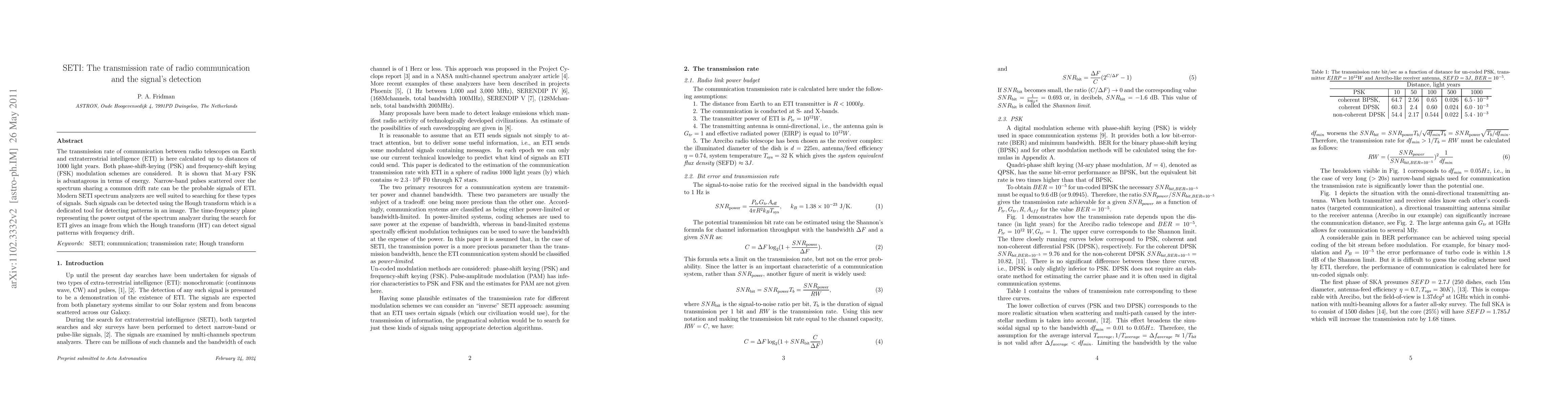 The transmission rate of communication between radio telescopes on Earth and extraterrestrial intelligence (ETI) is here calculated up to distances of 1000 light years. Both phase-shift-keying (PSK) and frequency-shift keying (FSK) modulation schemes are considered. It is shown that M-ary FSK is advantageous in terms of energy. Narrow-band pulses scattered over the spectrum sharing a common drift rate can be the probable signals of ETI. Modern SETI spectrum analyzers are well suited to searching for these types of signals. Such signals can be detected using the Hough transform which is a dedicated tool for detecting patterns in an image. The time-frequency plane representing the power output of the spectrum analyzer during the search for ETI gives an image from which the Hough transform (HT) can detect signal patterns with frequency drift.