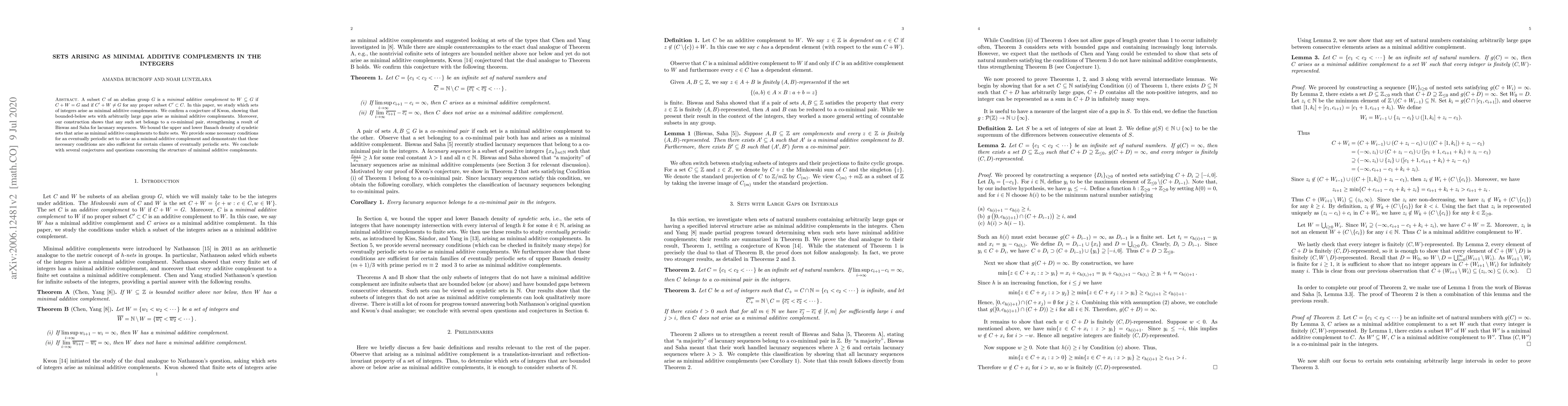 This paper investigates sets of integers that serve as minimal additive complements in abelian groups, confirming a conjecture about bounded-below sets with large gaps. It also establishes necessary and sufficient conditions for certain eventually periodic sets to be minimal additive complements and proposes further conjectures regarding their structure.
