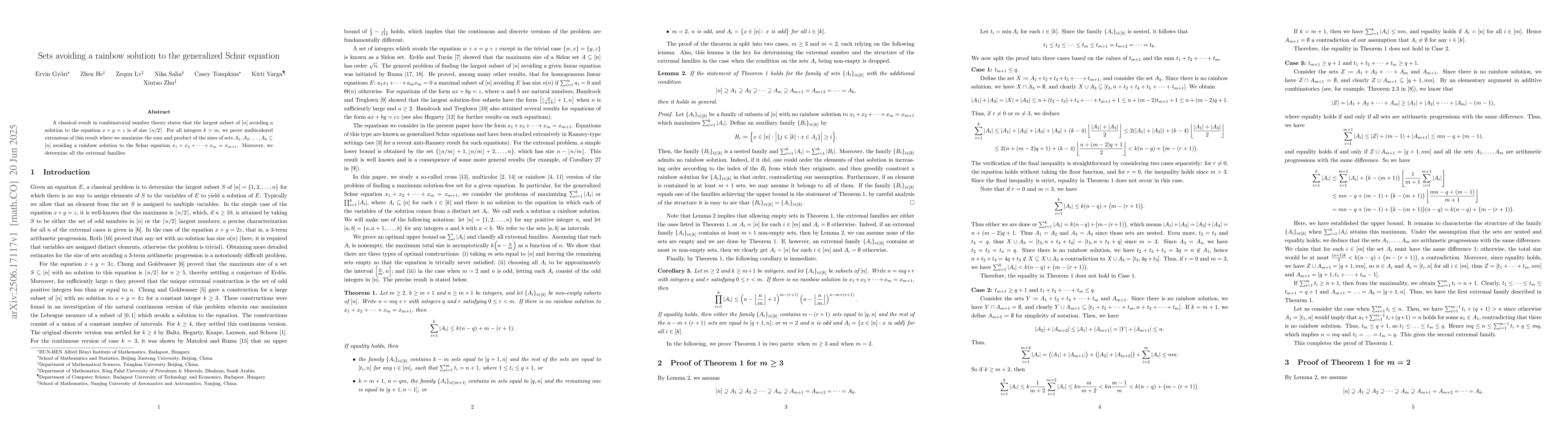 A classical result in combinatorial number theory states that the largest subset of $[n]$ avoiding a solution to the equation $x+y=z$ is of size $\lceil n/2 \rceil$. For all integers $k>m$, we prove multicolored extensions of this result where we maximize the sum and product of the sizes of sets $A_1,A_2,\dots,A_k \subseteq [n]$ avoiding a rainbow solution to the Schur equation $x_1+x_2+\dots+x_m=x_{m+1}$. Moreover, we determine all the extremal families.