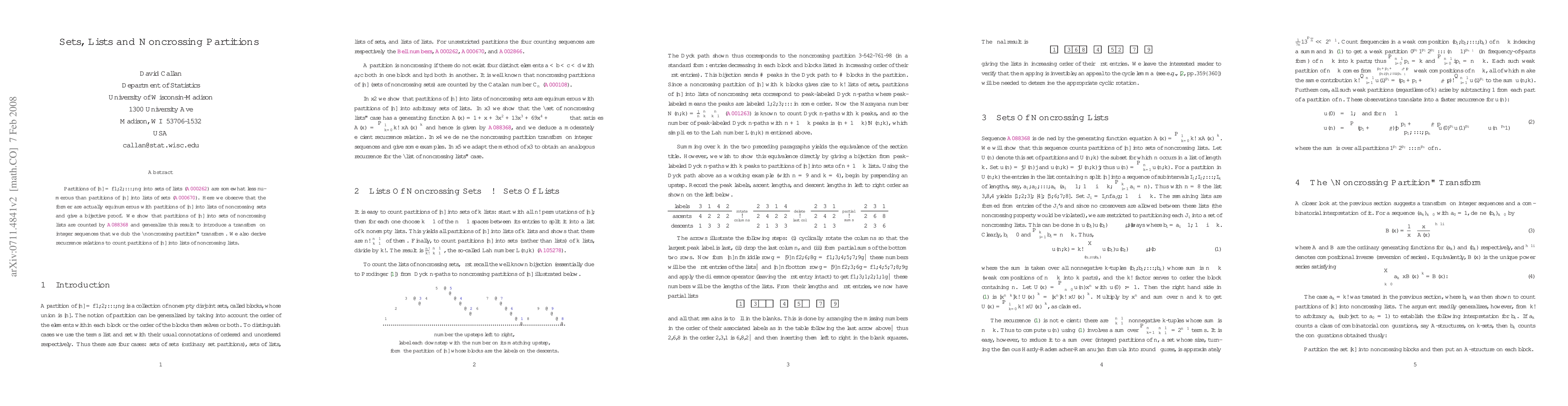 This paper establishes a bijection between partitions of [n] into sets of lists and partitions into lists of noncrossing sets, proving their equinumerosity. It introduces a "noncrossing partition" transform on integer sequences and derives recurrence relations for counting these partitions.