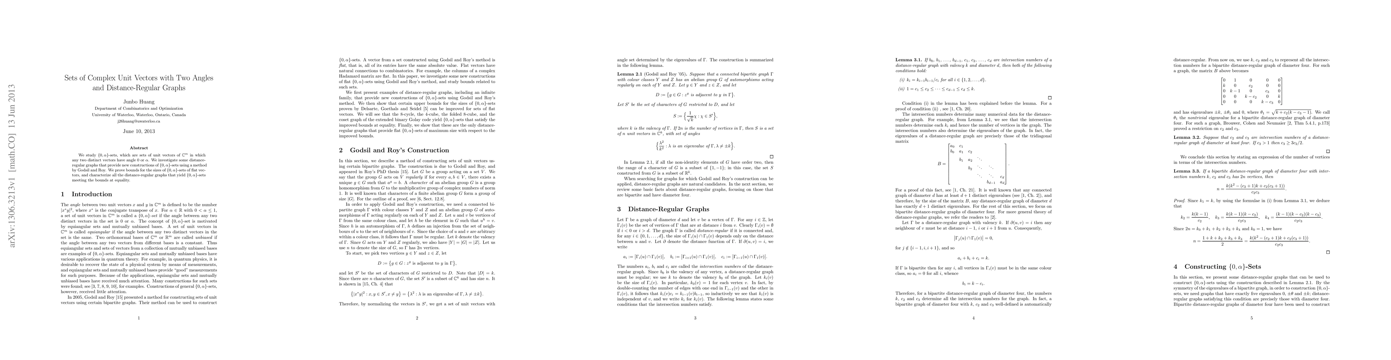 This paper explores {0,\alpha}-sets of complex unit vectors in $\mathbb{C}^m$, where any two distinct vectors have angles of either 0 or \alpha. It constructs these sets using distance-regular graphs and proves bounds for their sizes, identifying graphs that achieve these bounds.