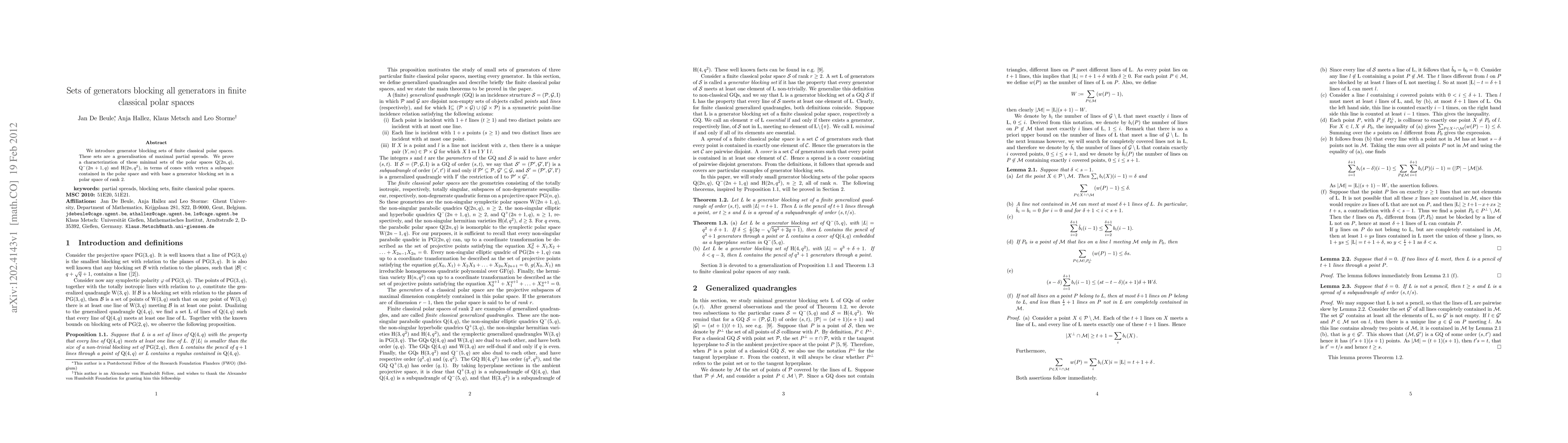 Summary: This paper introduces generator blocking sets in finite classical polar spaces, a generalization of maximal partial spreads, and provides a characterization for these minimal sets in specific polar spaces, utilizing cones with a defined vertex and base structure.