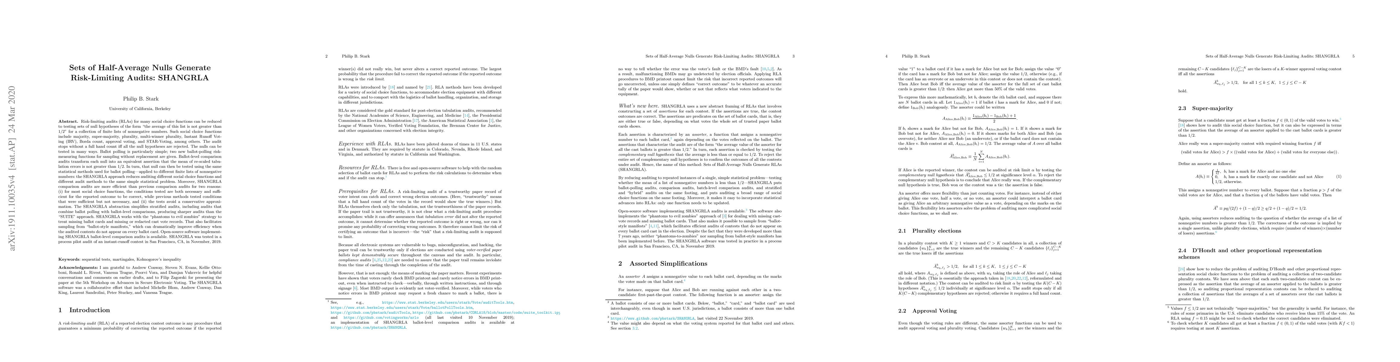 This paper introduces SHANGRLA, a method for generating risk-limiting audits (RLAs) that tests sets of half-average nulls for various social choice functions. SHANGRLA compares re-scaled tabulation errors to 1/2, offering more efficient and accurate audits than previous methods.