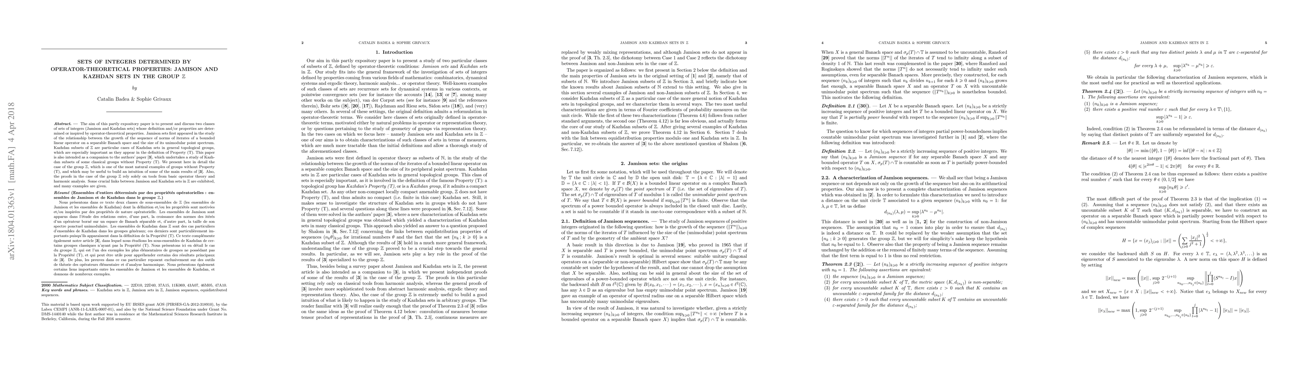 The aim of this partly expository paper is to present and discuss two classes of sets of integers (Jamison and Kazhdan sets) whose definition and/or properties are determined or inspired by operator-theoretical properties. Jamison sets first appeared in the study of the relationship between the growth of the sequence of norms of iterates of a bounded linear operator on a separable Banach space and the size of its unimodular point spectrum. Kazhdan subsets of $\mathbb{Z}$ are particular cases of Kazhdan sets in general topological groups, which are especially important as they appear in the definition of Property (T). This paper is also intended as a companion to the authors' paper [C.Badea, S.Grivaux, Kazhdan sets in groups and equidistribution properties, \emph{J. Funct. Anal.} \textbf{273} (2017), p. 1931 -- 1969], which undertakes a study of Kazhdan subsets of some classical groups without Property (T). We present here in detail the case of the group $\mathbb{Z}$, which is one of the most natural examples of groups without Property (T), and which may be useful to build an intuition of some of the main results of [C.Badea, S.Grivaux, Kazhdan sets in groups and equidistribution properties, op. cit.]. Also, the proofs in the case of the group $\mathbb{Z}$ rely solely on tools from basic operator theory and harmonic analysis. Some crucial links between Jamison and Kazhdan sets in $\mathbb{Z}$ are exhibited, and many examples are given.