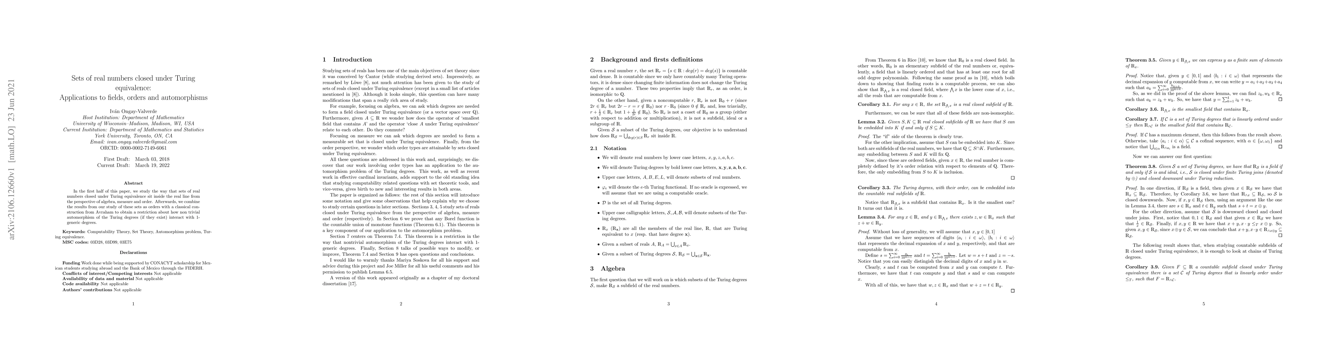 In the first half of this paper, we study the way that sets of real numbers closed under Turing equivalence sit inside the real line from the perspective of algebra, measure and order. Afterwards, we combine the results from our study of these sets as orders with a classical construction from Avraham to obtain a restriction about how non trivial automorphism of the Turing degrees (if they exist) interact with $1$-generic degrees.