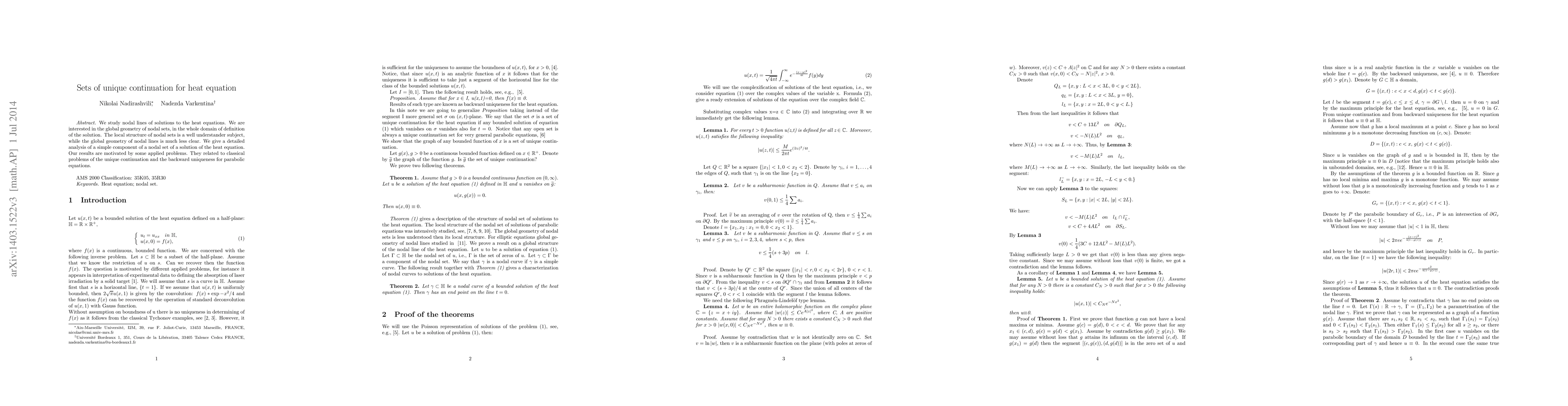 This paper investigates the global geometry of nodal lines in solutions to the heat equation, focusing on the unique continuation of these nodal sets throughout the solution's domain. While local nodal structures are well understood, the paper provides a detailed analysis of a particular component of a nodal set's global geometry.