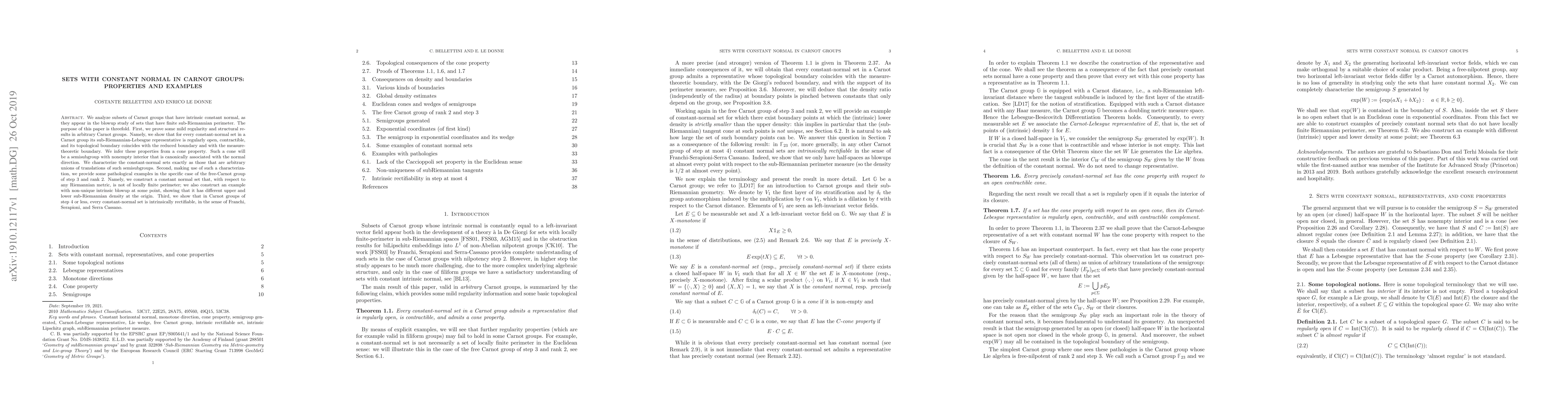 We analyze subsets of Carnot groups that have intrinsic constant normal, as they appear in the blowup study of sets that have finite sub-Riemannian perimeter. The purpose of this paper is threefold. First, we prove some mild regularity and structural results in arbitrary Carnot groups. Namely, we show that for every constant-normal set in a Carnot group its sub-Riemannian-Lebesgue representative is regularly open, contractible, and its topological boundary coincides with the reduced boundary and with the measure-theoretic boundary. We infer these properties from a cone property. Such a cone will be a semisubgroup with nonempty interior that is canonically associated with the normal direction. We characterize the constant-normal sets exactly as those that are arbitrary unions of translations of such semisubgroups. Second, making use of such a characterization, we provide some pathological examples in the specific case of the free-Carnot group of step 3 and rank 2. Namely, we construct a constant normal set that, with respect to any Riemannian metric, is not of locally finite perimeter; we also construct an example with non-unique intrinsic blowup at some point, showing that it has different upper and lower sub-Riemannian density at the origin. Third, we show that in Carnot groups of step 4 or less, every constant-normal set is intrinsically rectifiable, in the sense of Franchi, Serapioni, and Serra Cassano.