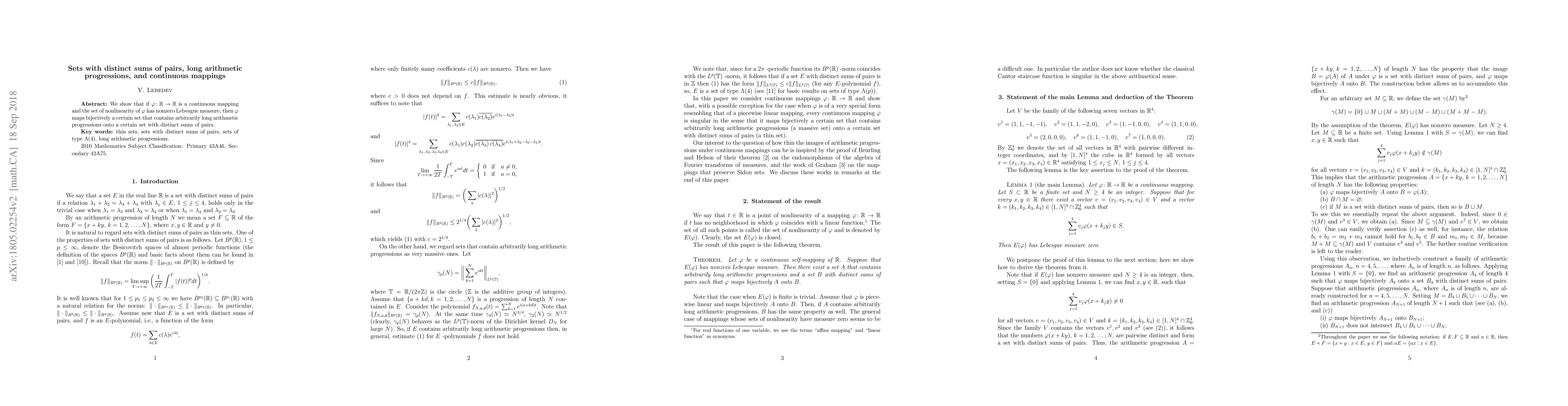 We show that if $\varphi \colon \mathbb R\rightarrow\mathbb R$ is a continuous mapping and the set of nonlinearity of $\varphi$ has nonzero Lebesgue measure, then $\varphi$ maps bijectively a certain set that contains arbitrarily long arithmetic progressions onto a certain set with distinct sums of pairs.