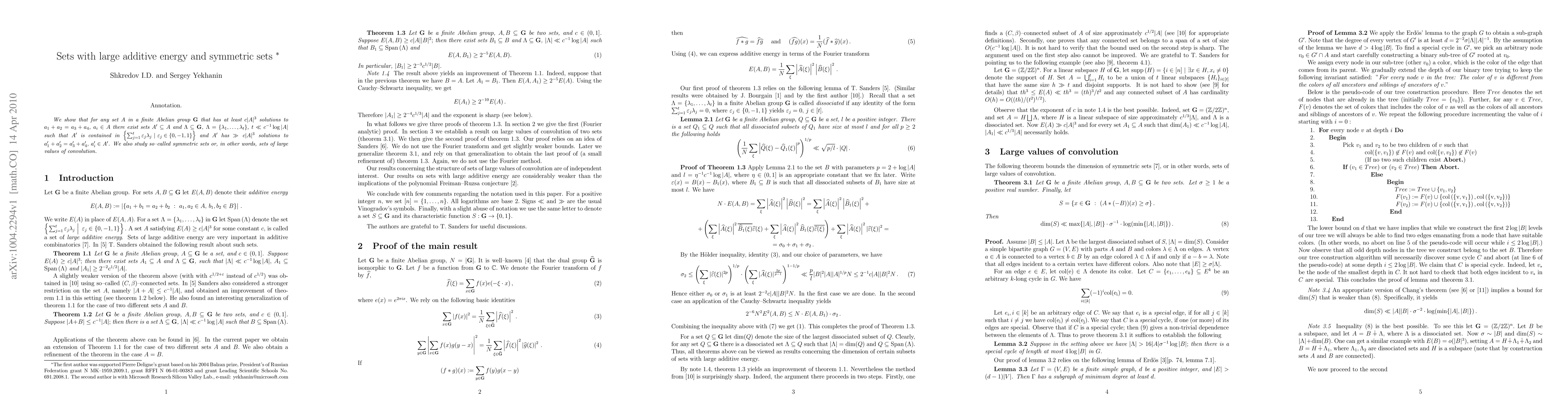We show that for any set A in a finite Abelian group G that has at least c |A|^3 solutions to a_1 + a_2 = a_3 + a_4, where a_i belong A there exist sets A' in A and L in G, |L| \ll c^{-1} log |A| such that A' is contained in Span of L and A' has approximately c |A|^3 solutions to a'_1 + a'_2 = a'_3 + a'_4, where a'_i belong A'. We also study so-called symmetric sets or, in other words, sets of large values of convolution.