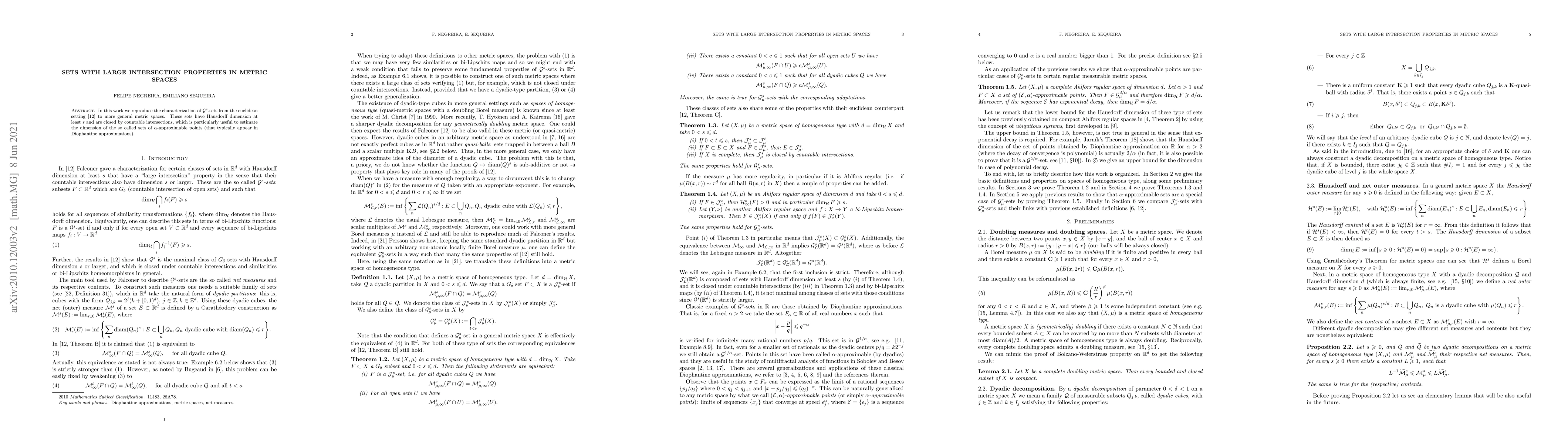 This paper characterizes sets with large intersection properties in metric spaces, generalizing a result from Euclidean space to broader metric settings. These sets have a minimum Hausdorff dimension, making them useful for estimating the dimension of certain types of points that appear in Diophantine approximations.