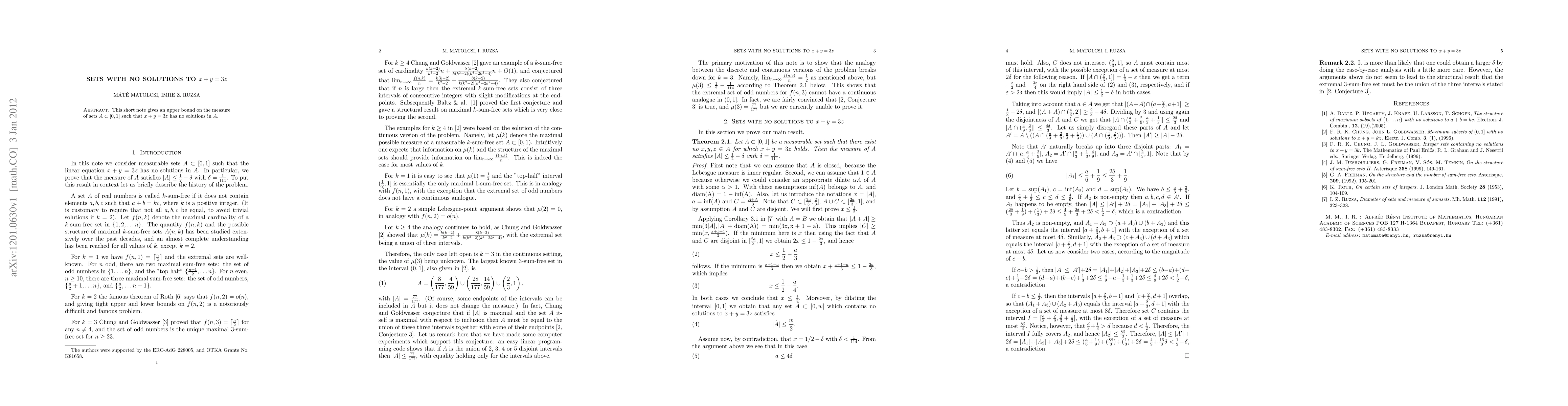 This short note gives an upper bound on the measure of sets $A\subset [0,1]$ such that $x+y=3z$ has no solutions in $A$.