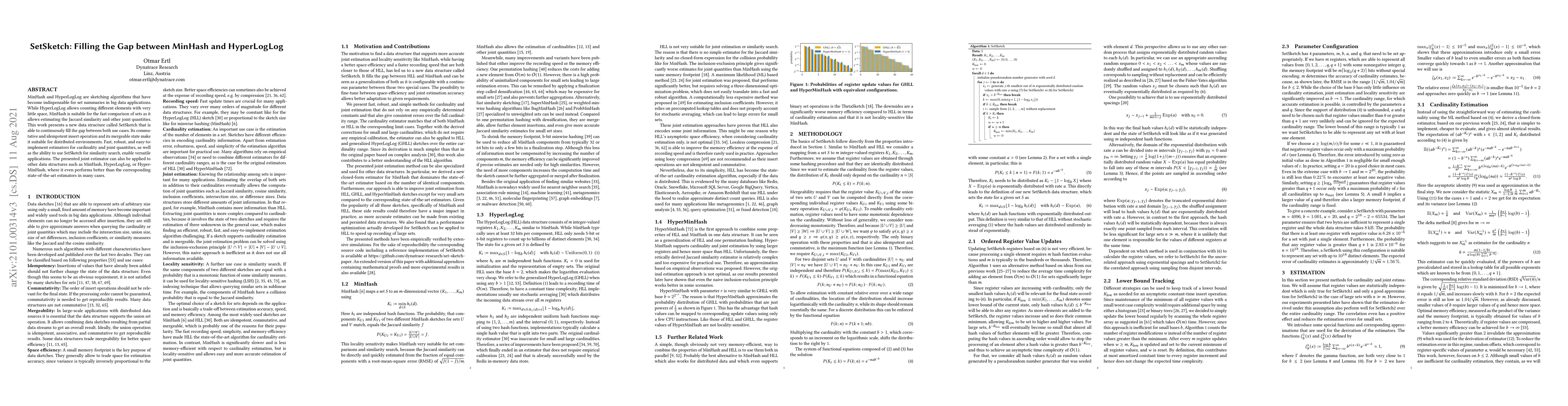 SetSketch bridges the gap between MinHash and HyperLogLog by offering a versatile data structure for set summaries, enabling both cardinality estimation and fast set similarity comparisons. Its mergeable and commutative properties make it suitable for distributed environments, while its joint estimators outperform existing state-of-the-art methods.