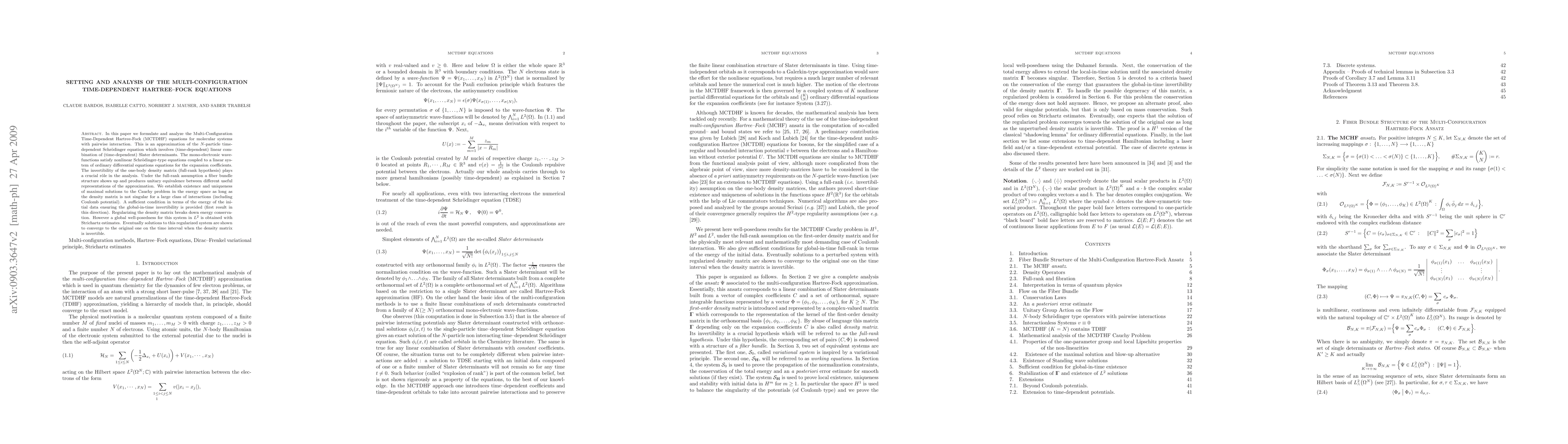 In this paper we motivate, formulate and analyze the Multi-Configuration Time-Dependent Hartree-Fock (MCTDHF) equations for molecular systems under Coulomb interaction. They consist in approximating the N-particle Schrodinger wavefunction by a (time-dependent) linear combination of (time-dependent) Slater determinants. The equations of motion express as a system of ordinary differential equations for the expansion coefficients coupled to nonlinear Schrodinger-type equations for mono-electronic wavefunctions. The invertibility of the one-body density matrix (full-rank hypothesis) plays a crucial role in the analysis. Under the full-rank assumption a fiber bundle structure shows up and produces unitary equivalence between convenient representations of the equations. We discuss and establish existence and uniqueness of maximal solutions to the Cauchy problem in the energy space as long as the density matrix is not singular. A sufficient condition in terms of the energy of the initial data ensuring the global-in-time invertibility is provided (first result in this direction). Regularizing the density matrix breaks down energy conservation, however a global well-posedness for this system in L^2 is obtained with Strichartz estimates. Eventually solutions to this regularized system are shown to converge to the original one on the time interval when the density matrix is invertible.