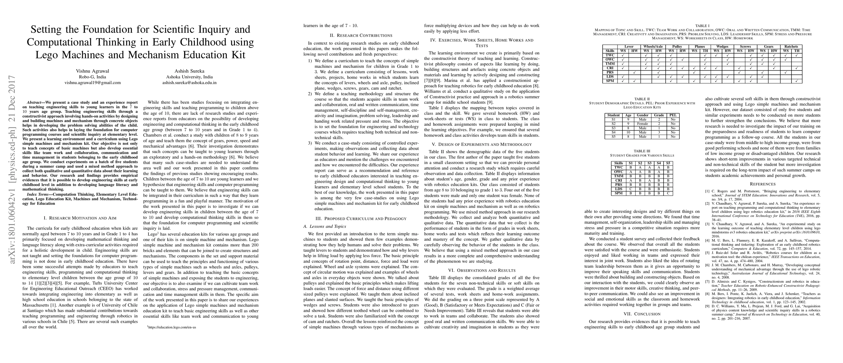 We present a case study and an experience report on teaching engineering skills to young learners in the 7 to 10 years age group. Teaching engineering skills through a constructivist approach involving hands-on activities by designing and building machines and mechanism through concrete objects helps in developing the problem solving abilities of the child. Such activities also helps in laying the foundation for computer programming courses and scientific inquiry at elementary level. We present a learning environment and a curriculum using Lego simple machines and mechanism kit. Our objective is not only to teach concepts of basic machines but also develop essential skills like team work and collaboration, communication and time management in students belonging to the early childhood age group. We conduct experiments on a batch of five students during a summer camp and used a mixed method approach to collect both qualitative and quantitative data about their learning and behavior. Our research and findings provides empirical evidences that it is possible to develop engineering skills at early childhood level in addition to developing language literacy and mathematical thinking.