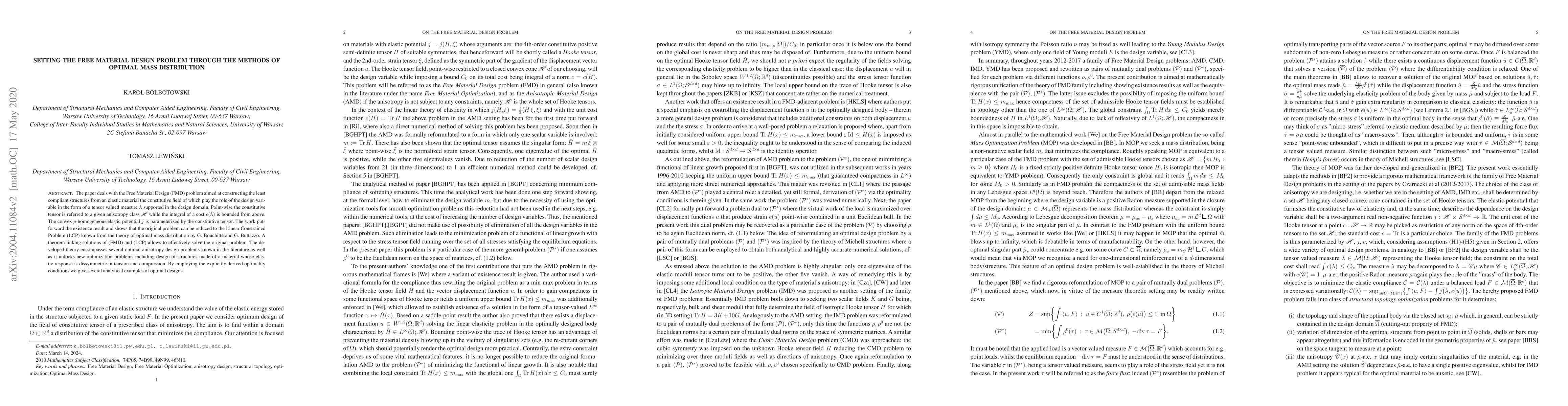 The paper deals with the Free Material Design (FMD) problem aimed at constructing the least compliant structures from an elastic material the constitutive field of which play the role of the design variable in the form of a tensor valued measure $\lambda$ supported in the design domain. Point-wise the constitutive tensor is referred to a given anisotropy class $\mathscr{H}$ while the integral of a cost $c(\lambda)$ is bounded from above. The convex $p$-homogeneous elastic potential $j$ is parameterized by the constitutive tensor. The work puts forward the existence result and shows that the original problem can be reduced to the Linear Constrained Problem (LCP) known from the theory of optimal mass distribution by G. Bouchitt\'{e} and G. Buttazzo. A theorem linking solutions of (FMD) and (LCP) allows to effectively solve the original problem. The developed theory encompasses several optimal anisotropy design problems known in the literature as well as it unlocks new optimization problems including design of structures made of a material whose elastic response is dissymmetric in tension and compression. By employing the explicitly derived optimality conditions we give several analytical examples of optimal designs.