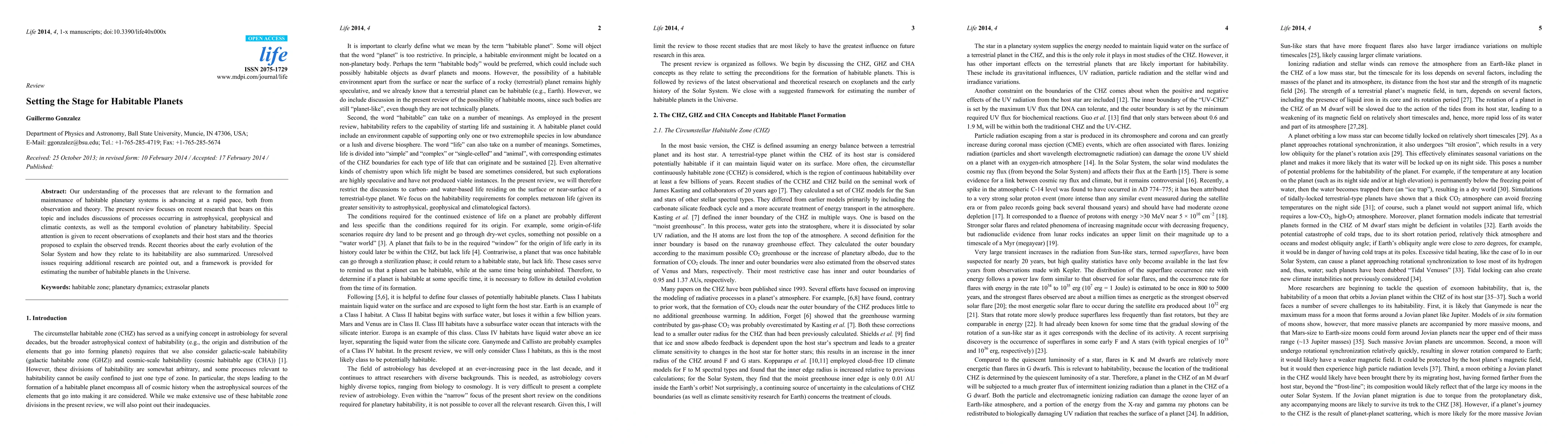 Our understanding of the processes that are relevant to the formation and maintenance of habitable planetary systems is advancing at a rapid pace, both from observation and theory. The present review focuses on recent research that bears on this topic and includes discussions of processes occurring in astrophysical, geophysical and climatic contexts, as well as the temporal evolution of planetary habitability. Special attention is given to recent observations of exoplanets and their host stars and the theories proposed to explain the observed trends. Recent theories about the early evolution of the Solar System and how they relate to its habitability are also summarized. Unresolved issues requiring additional research are pointed out, and a framework is provided for estimating the number of habitable planets in the Universe.