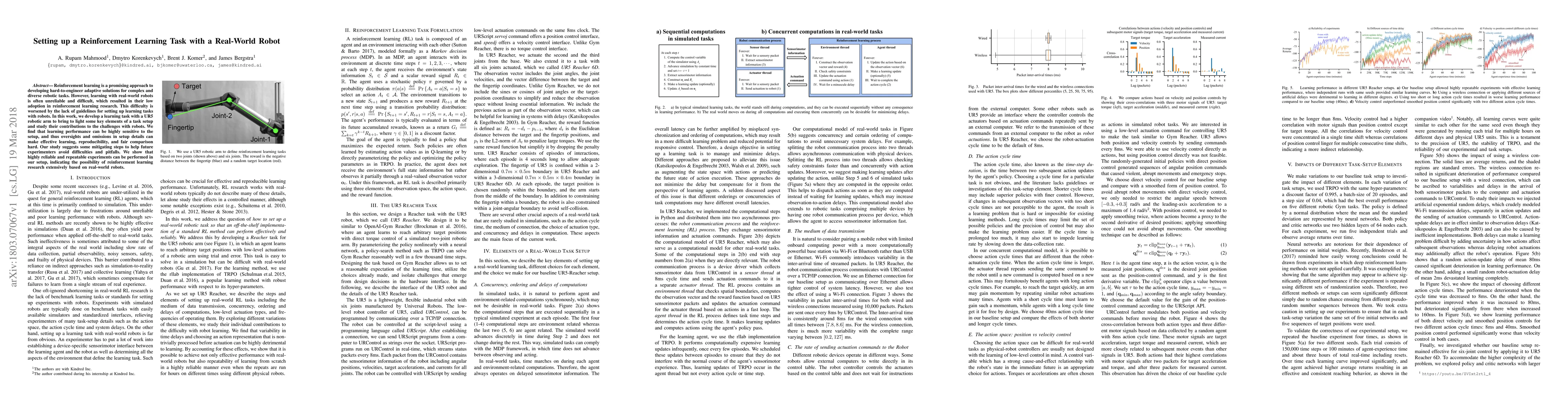 This paper develops a reinforcement learning task using a UR5 robotic arm to highlight key elements in setting up such tasks and their impact on learning performance. It finds that setup details significantly affect learning outcomes, suggesting steps to mitigate these challenges and improve reproducibility.