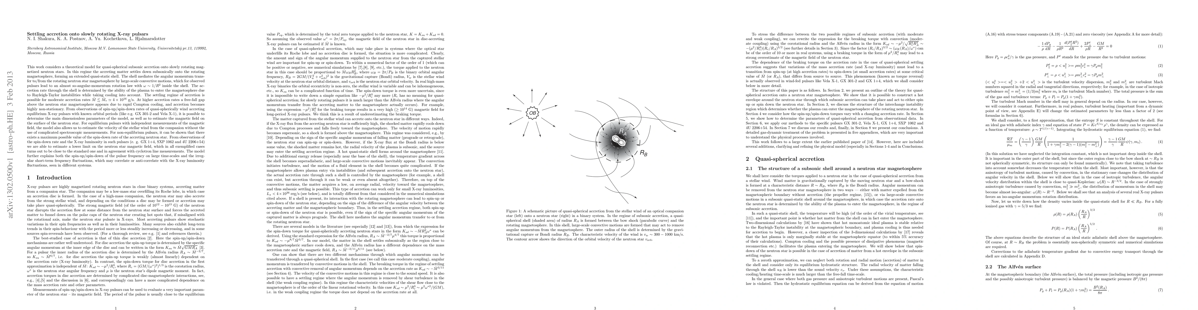 This paper investigates quasi-spherical accretion onto slowly rotating X-ray pulsars, proposing a model where accretion forms a shell that mediates angular momentum transfer. The model explains spin-up/spin-down rates and estimates neutron star magnetic fields, showing consistency with standard values and explaining frequency fluctuations.