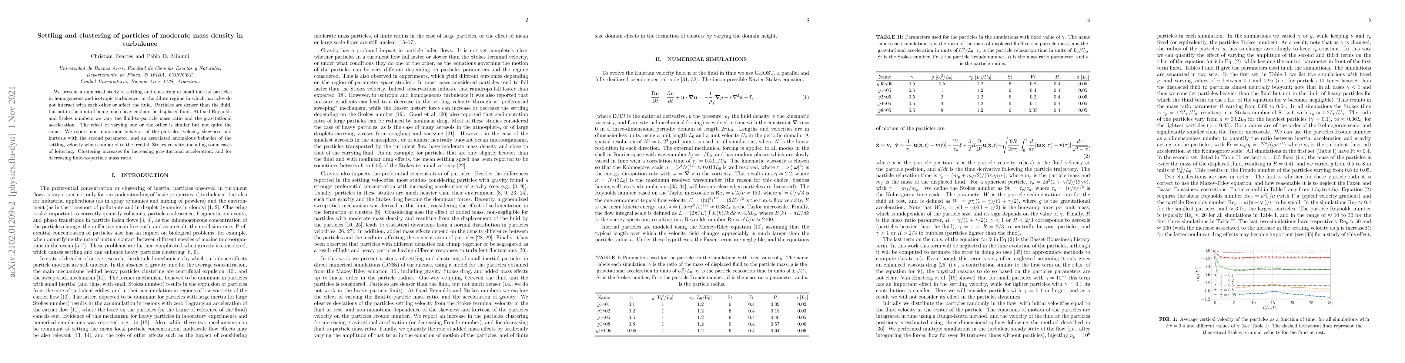 We present a numerical study of settling and clustering of small inertial particles in homogeneous and isotropic turbulence. Particles are denser than the fluid, but not in the limit of being much heavier than the displaced fluid. At fixed Reynolds and Stokes numbers we vary the fluid-to-particle mass ratio and the gravitational acceleration. The effect of varying one or the other is similar but not quite the same. We report non-monotonic behavior of the particles' velocity skewness and kurtosis with the second parameter, and an associated anomalous behavior of the settling velocity when compared to the free-fall Stokes velocity, including loitering cases. Clustering increases for increasing gravitational acceleration, and for decreasing fluid-to-particle mass ratio.