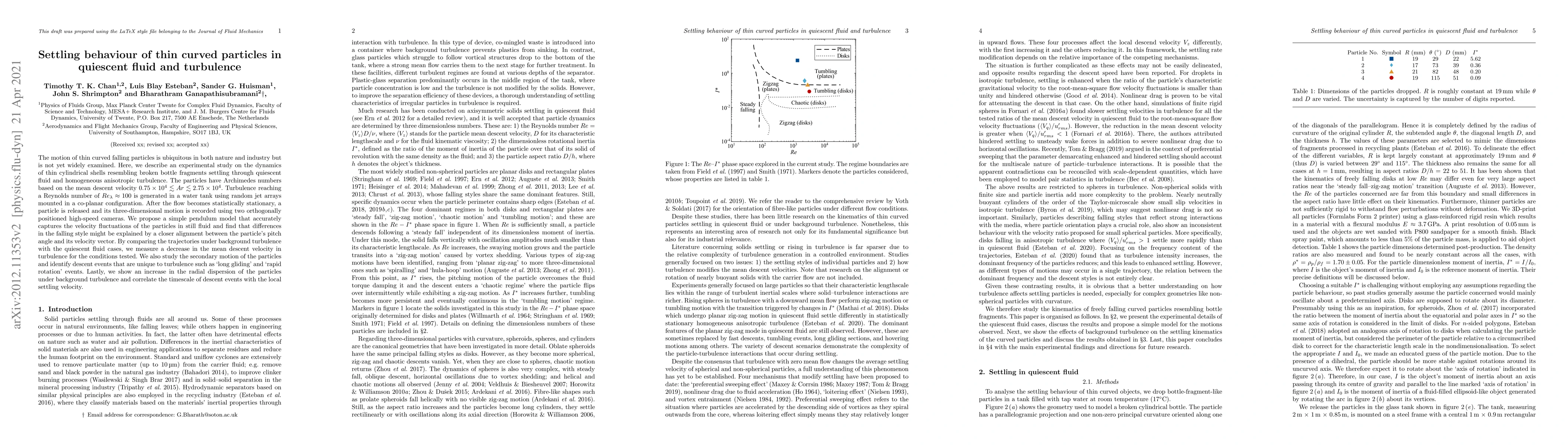 This paper investigates the settling behavior of thin curved particles, like broken bottle fragments, in both quiescent fluid and turbulent environments. Experimental results reveal distinct differences in particle motion, with turbulence causing decreased mean descent velocity and unique behaviors such as 'long gliding' and 'rapid rotation' events, alongside increased radial dispersion.