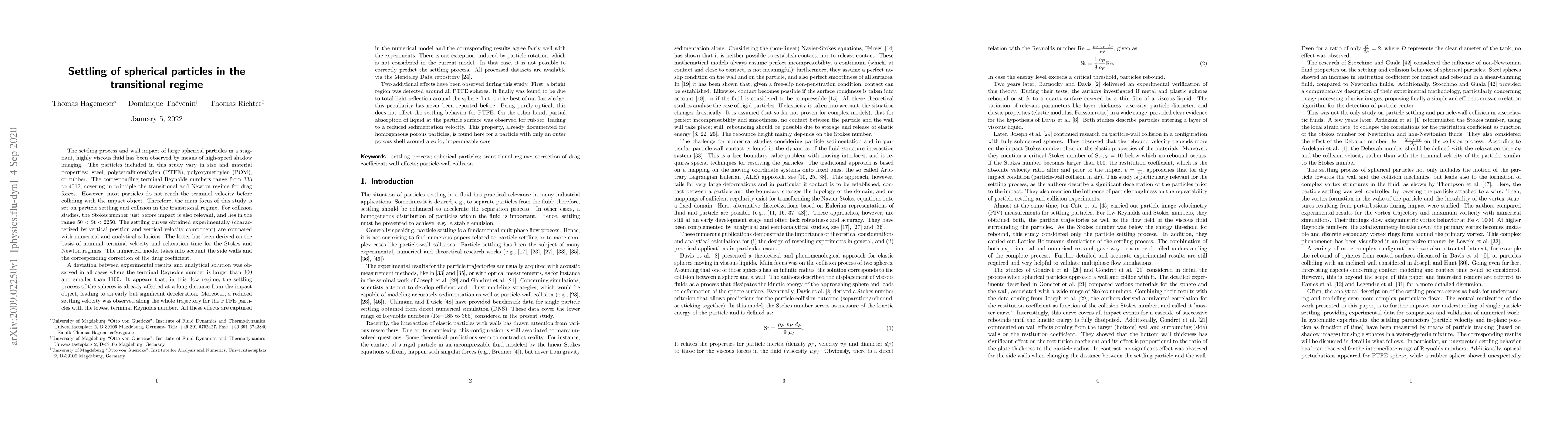 The settling process and wall impact of large spherical particles in a stagnant, highly viscous fluid has been observed by means of high-speed shadow imaging. The particles included in this study vary in size and material properties: steel, polytetrafluorethylen (PTFE), polyoxymethylen (POM), or rubber. The corresponding terminal Reynolds numbers range from 333 to 4012, covering in principle the transitional and Newton regime for drag forces. For collision studies, the Stokes number just before impact is also relevant, and lies in the range 50 < St < 2250. The settling curves obtained experimentally are compared with numerical and analytical solutions. The latter has been derived on the basis of nominal terminal velocity and relaxation time for the Stokes and Newton regimes. A deviation between experimental results and analytical solution was observed in all cases where the terminal Reynolds number is larger than 300 and smaller than 1100. In this flow regime, the settling process of the spheres is already affected at a long distance from the impact object, leading to an early but significant deceleration. Moreover, a reduced settling velocity was observed along the whole trajectory for the PTFE particles with the lowest terminal Reynolds number. All processed datasets are available via the Mendeley Data repository. Two additional effects have been observed during this study. First, a bright region was detected around all PTFE spheres. It finally was found to be due to total light reflection around the sphere, but, to the best of our knowledge, this peculiarity has never been reported before. Being purely optical, this does not effect the settling behavior for PTFE. On the other hand, partial absorption of liquid at the particle surface was observed for rubber, leading to a reduced sedimentation velocity.