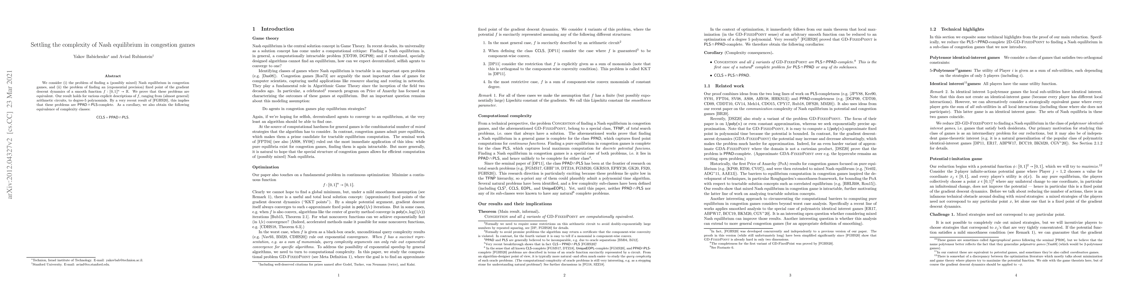 A recent paper proves that finding a Nash equilibrium in congestion games is equivalent to finding a fixed point of gradient descent dynamics for smooth functions, with implications for complexity classes CCLS and PPAD ∩ PLS.