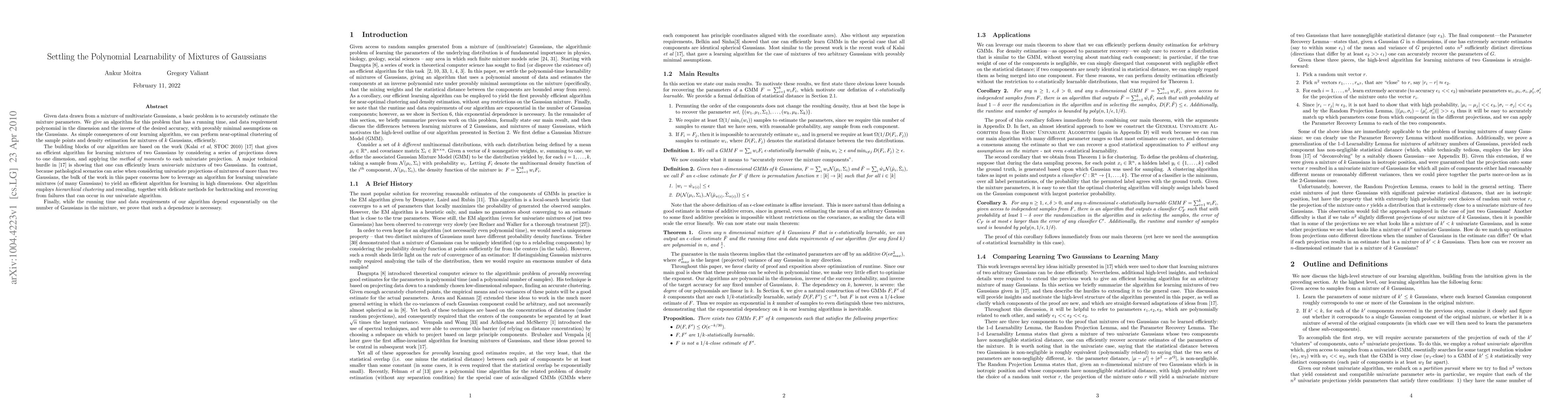 Given data drawn from a mixture of multivariate Gaussians, a basic problem is to accurately estimate the mixture parameters. We give an algorithm for this problem that has a running time, and data requirement polynomial in the dimension and the inverse of the desired accuracy, with provably minimal assumptions on the Gaussians. As simple consequences of our learning algorithm, we can perform near-optimal clustering of the sample points and density estimation for mixtures of k Gaussians, efficiently. The building blocks of our algorithm are based on the work Kalai et al. [STOC 2010] that gives an efficient algorithm for learning mixtures of two Gaussians by considering a series of projections down to one dimension, and applying the method of moments to each univariate projection. A major technical hurdle in Kalai et al. is showing that one can efficiently learn univariate mixtures of two Gaussians. In contrast, because pathological scenarios can arise when considering univariate projections of mixtures of more than two Gaussians, the bulk of the work in this paper concerns how to leverage an algorithm for learning univariate mixtures (of many Gaussians) to yield an efficient algorithm for learning in high dimensions. Our algorithm employs hierarchical clustering and rescaling, together with delicate methods for backtracking and recovering from failures that can occur in our univariate algorithm. Finally, while the running time and data requirements of our algorithm depend exponentially on the number of Gaussians in the mixture, we prove that such a dependence is necessary.