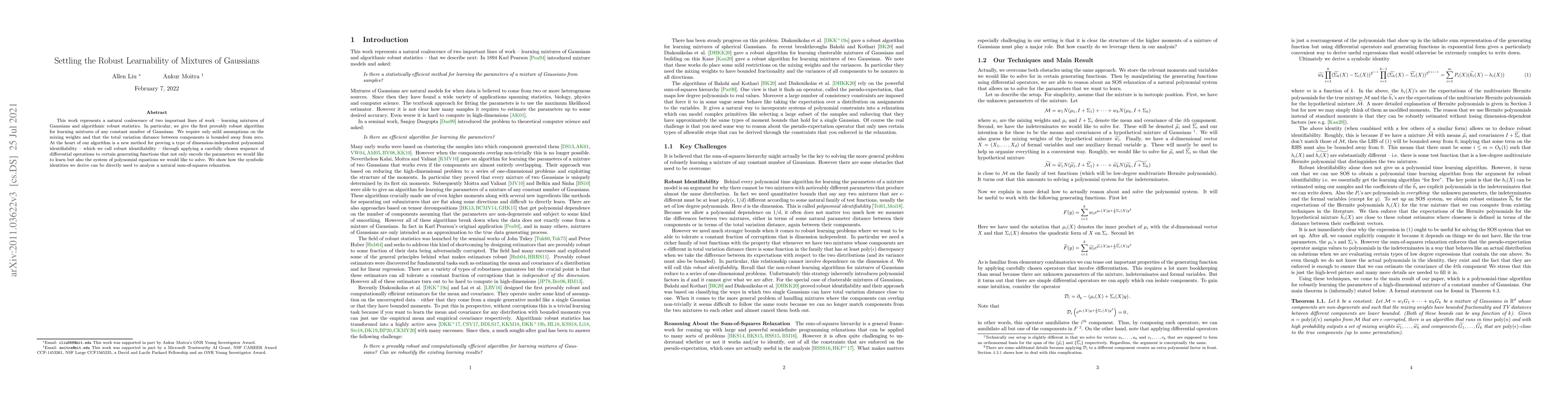 This paper presents the first provably robust algorithm for learning mixtures of Gaussians under mild assumptions, leveraging a novel method that applies differential operations to generating functions to achieve dimension-independent polynomial identifiability, and uses these symbolic identities to analyze a sum-of-squares relaxation.