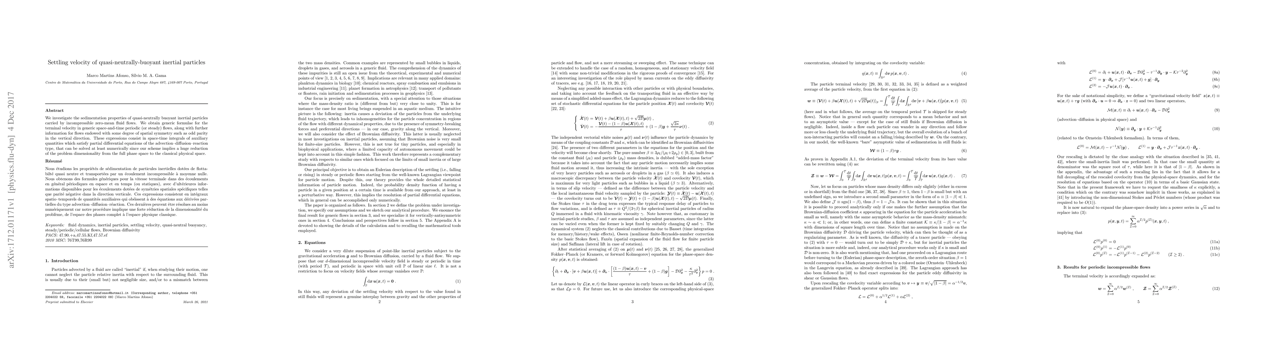 This paper investigates the sedimentation of quasi-neutrally buoyant inertial particles in incompressible fluid flows, deriving generic formulae for their terminal velocity in periodic or steady flows. The study simplifies the problem dimensionality, allowing for numerical solutions of the advection-diffusion-reaction partial differential equations.