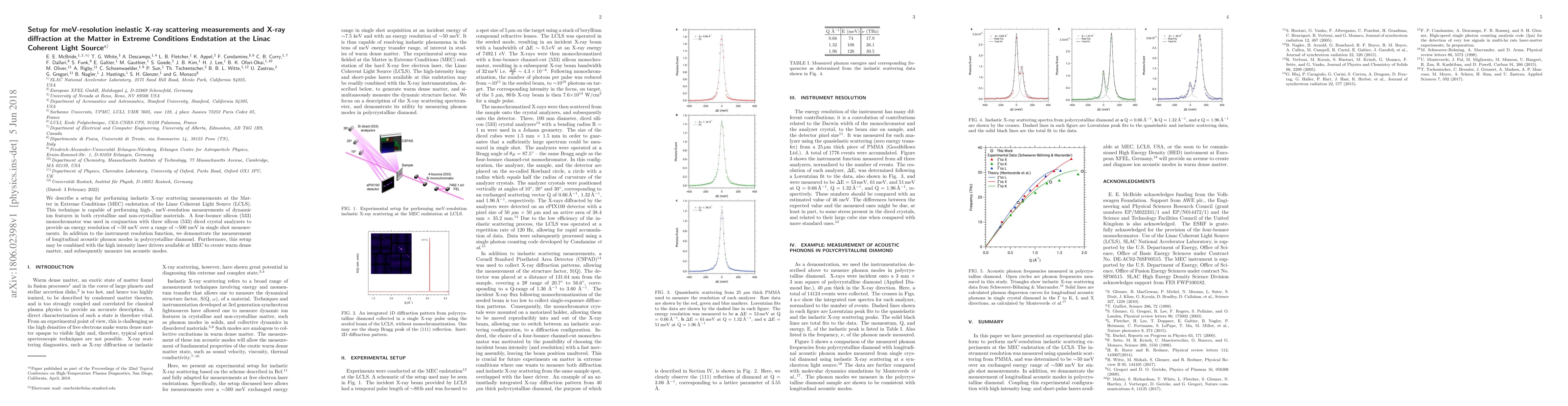 This paper details a setup for high-resolution inelastic X-ray scattering measurements at the Matter in Extreme Conditions endstation of the LCLS, achieving ~50 meV resolution. The setup uses a four-bounce silicon monochromator and three silicon analyzers, demonstrated by measuring phonon modes in polycrystalline diamond.
