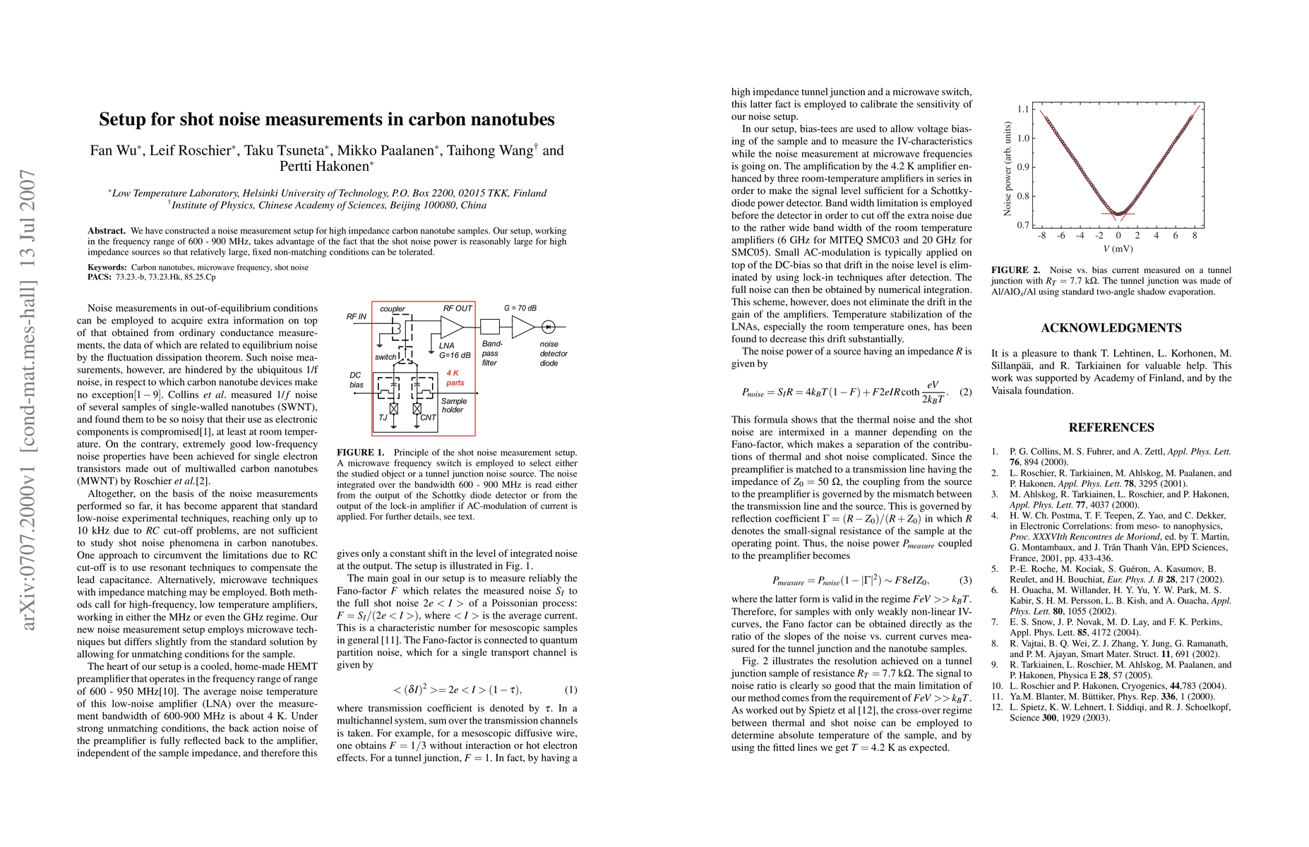 Summary: This paper details a noise measurement setup for high impedance carbon nanotubes, operating between 600-900 MHz, which leverages the significant shot noise power to accommodate large non-matching conditions. The setup aims to accurately measure shot noise in these materials.