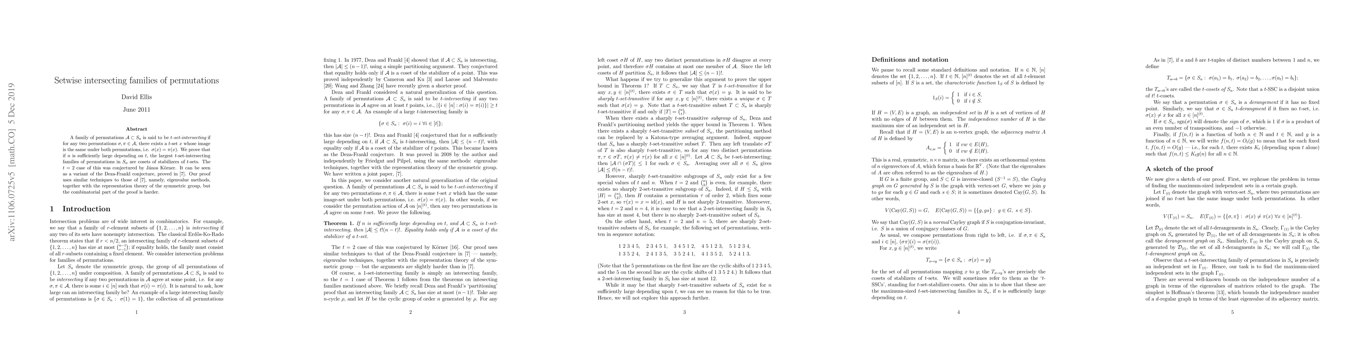 This paper proves that for sufficiently large $n$, the largest $t$-set-intersecting families of permutations in $S_n$ are cosets of stabilizers of $t$-sets, addressing a conjecture by János Kórner for $t=2$. The proof employs eigenvalue methods and representation theory of the symmetric group.