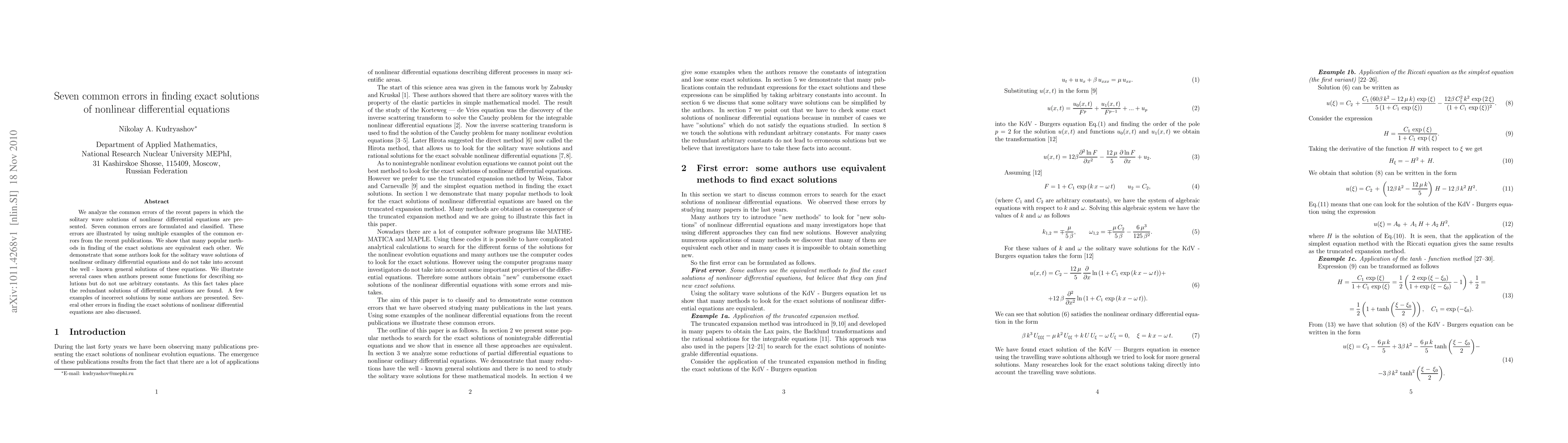 We analyze the common errors of the recent papers in which the solitary wave solutions of nonlinear differential equations are presented. Seven common errors are formulated and classified. These errors are illustrated by using multiple examples of the common errors from the recent publications. We show that many popular methods in finding of the exact solutions are equivalent each other. We demonstrate that some authors look for the solitary wave solutions of nonlinear ordinary differential equations and do not take into account the well - known general solutions of these equations. We illustrate several cases when authors present some functions for describing solutions but do not use arbitrary constants. As this fact takes place the redundant solutions of differential equations are found. A few examples of incorrect solutions by some authors are presented. Several other errors in finding the exact solutions of nonlinear differential equations are also discussed.
