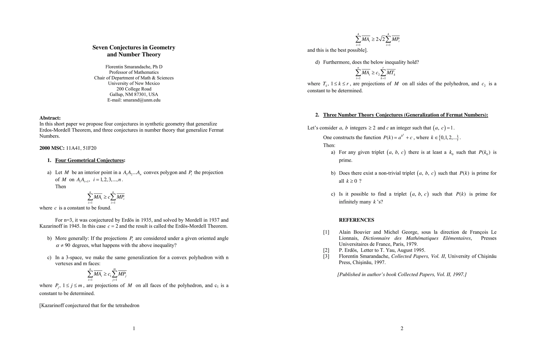 In this short paper we propose four conjectures in synthetic geometry that generalize Erdos-Mordell Theorem, and three conjectures in number theory that generalize Fermat Numbers.