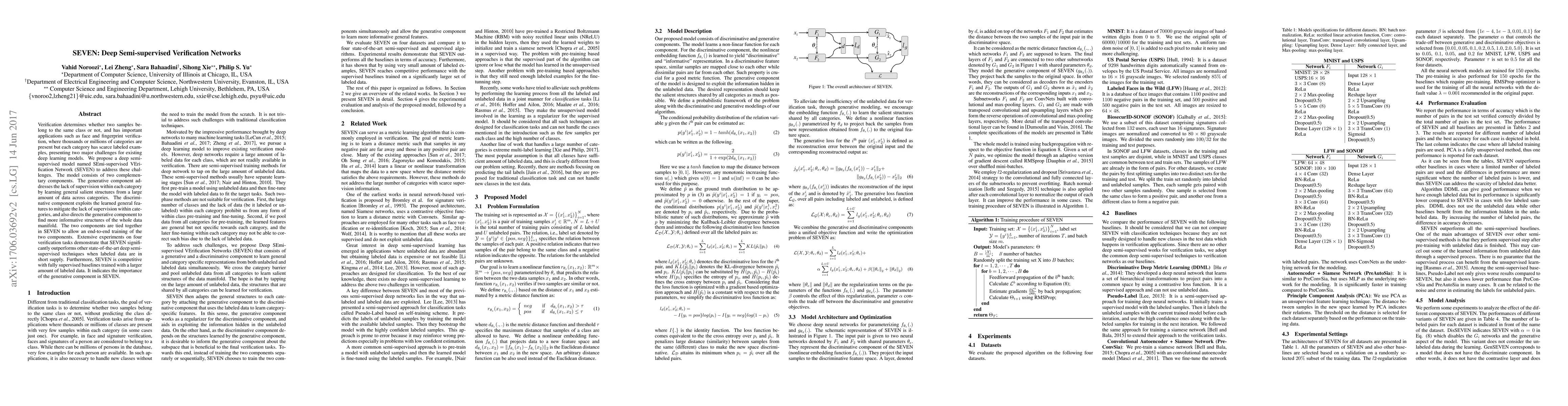 Verification determines whether two samples belong to the same class or not, and has important applications such as face and fingerprint verification, where thousands or millions of categories are present but each category has scarce labeled examples, presenting two major challenges for existing deep learning models. We propose a deep semi-supervised model named SEmi-supervised VErification Network (SEVEN) to address these challenges. The model consists of two complementary components. The generative component addresses the lack of supervision within each category by learning general salient structures from a large amount of data across categories. The discriminative component exploits the learned general features to mitigate the lack of supervision within categories, and also directs the generative component to find more informative structures of the whole data manifold. The two components are tied together in SEVEN to allow an end-to-end training of the two components. Extensive experiments on four verification tasks demonstrate that SEVEN significantly outperforms other state-of-the-art deep semi-supervised techniques when labeled data are in short supply. Furthermore, SEVEN is competitive with fully supervised baselines trained with a larger amount of labeled data. It indicates the importance of the generative component in SEVEN.
