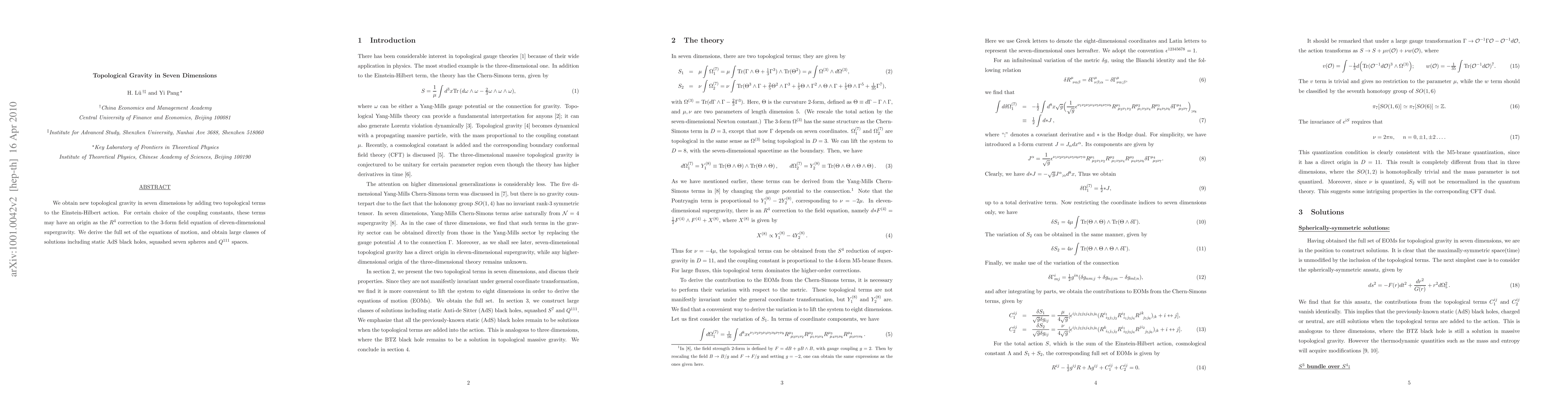 We construct new seven-dimensional gravity by adding two topological terms to the Einstein-Hilbert action. For certain choice of the coupling constants, these terms may be related to the R^4 correction to the 3-form field equation of eleven-dimensional supergravity. We derive the full set of the equations of motion. We find that the static spherically-symmetric black holes are unmodified by the topological terms. We obtain squashed AdS_7, and also squashed seven spheres and Q^{111} spaces in Euclidean signature.