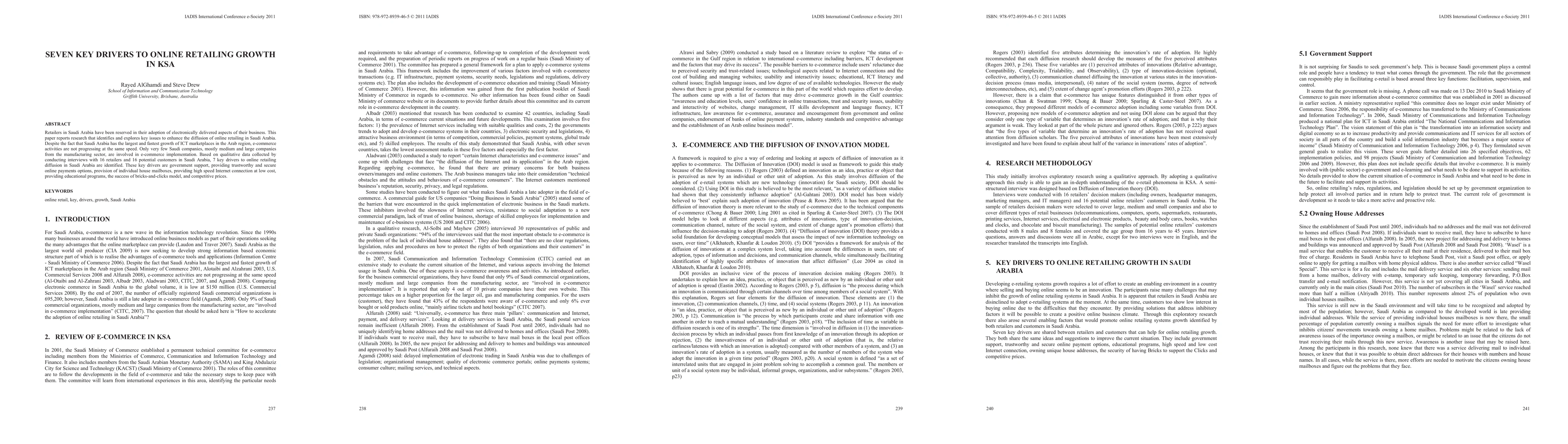 Retailers in Saudi Arabia have been reserved in their adoption of electronically delivered aspects of their business. This paper reports research that identifies and explores key issues to enhance the diffusion of online retailing in Saudi Arabia. Despite the fact that Saudi Arabia has the largest and fastest growth of ICT marketplaces in the Arab region, e-commerce activities are not progressing at the same speed. Only very few Saudi companies, mostly medium and large companies from the manufacturing sector, are involved in e-commerce implementation. Based on qualitative data collected by conducting interviews with 16 retailers and 16 potential customers in Saudi Arabia, 7 key drivers to online retailing diffusion in Saudi Arabia are identified. These key drivers are government support, providing trustworthy and secure online payments options, provision of individual house mailboxes, providing high speed Internet connection at low cost, providing educational programs, the success of bricks-and-clicks model, and competitive prices.