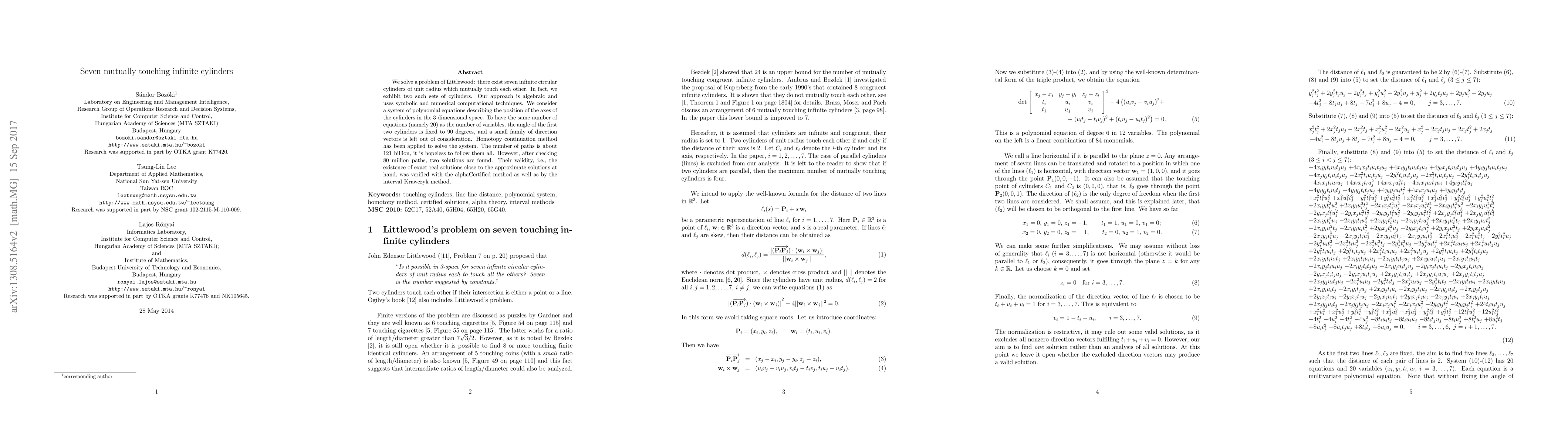 We solve a problem of Littlewood: there exist seven infinite circular cylinders of unit radius which mutually touch each other. In fact, we exhibit two such sets of cylinders. Our approach is algebraic and uses symbolic and numerical computational techniques. We consider a system of polynomial equations describing the position of the axes of the cylinders in the 3 dimensional space. To have the same number of equations (namely 20) as the number of variables, the angle of the first two cylinders is fixed to 90 degrees, and a small family of direction vectors is left out of consideration. Homotopy continuation method has been applied to solve the system. The number of paths is about 121 billion, it is hopeless to follow them all. However, after checking 80 million paths, two solutions are found. Their validity, i.e., the existence of exact real solutions close to the approximate solutions at hand, was verified with the alphaCertified method as well as by the interval Krawczyk method.