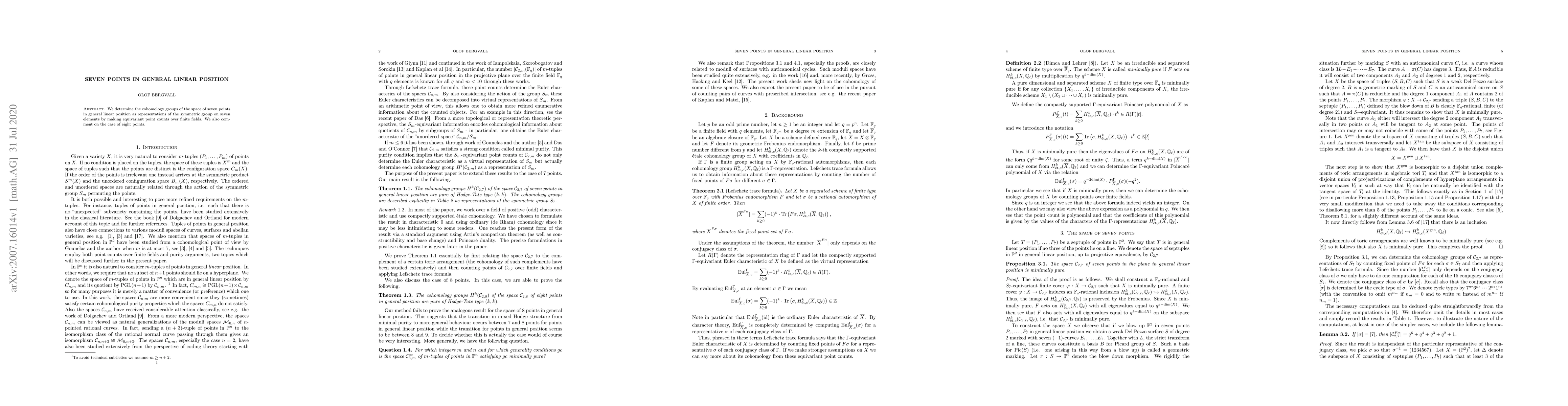 We determine the cohomology groups of the space of seven points in general linear position as representations of the symmetric group on seven elements by making equivariant point counts over finite fields. We also comment on the case of eight points.