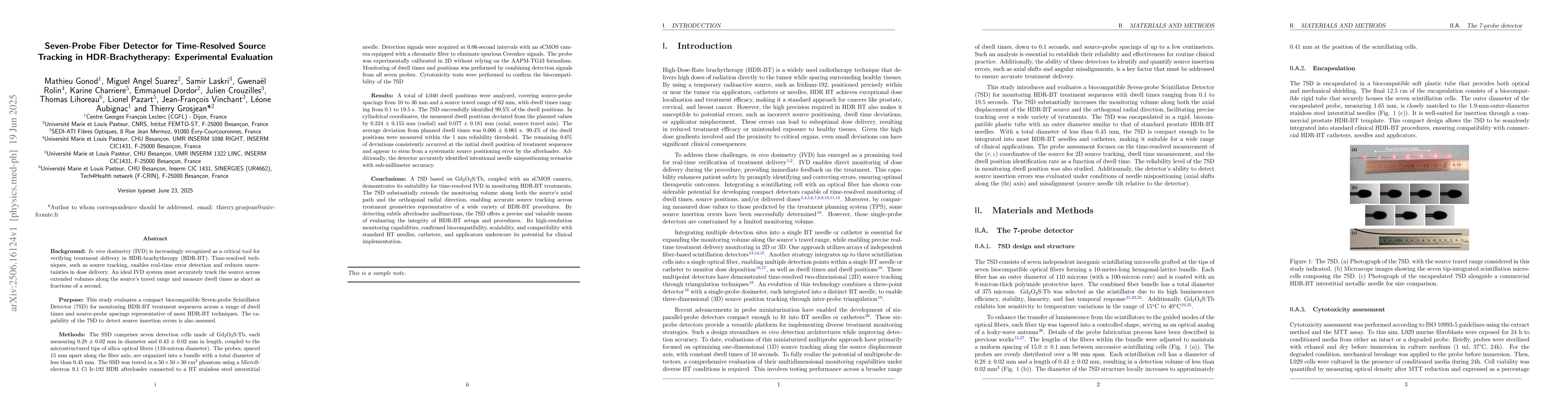 This research evaluates a compact, biocompatible Seven-probe Scintillator Detector (7SD) for monitoring High-Dose-Rate (HDR) brachytherapy treatments. The 7SD, with seven detection cells and a total diameter of less than 0.45 mm, successfully identified 99.5% of dwell positions across various source-probe spacings and dwell times. Deviations from planned positions were minimal (0.224 $pm$ 0.155 mm radially, 0.077 $pm$ 0.181 mm axially), and dwell time deviations were insignificant (0.006 $pm$ 0.061 s). The 7SD also accurately detected intentional needle mispositioning scenarios with sub-millimeter precision, identifying a systematic error in source positioning at the initial dwell of treatment sequences.