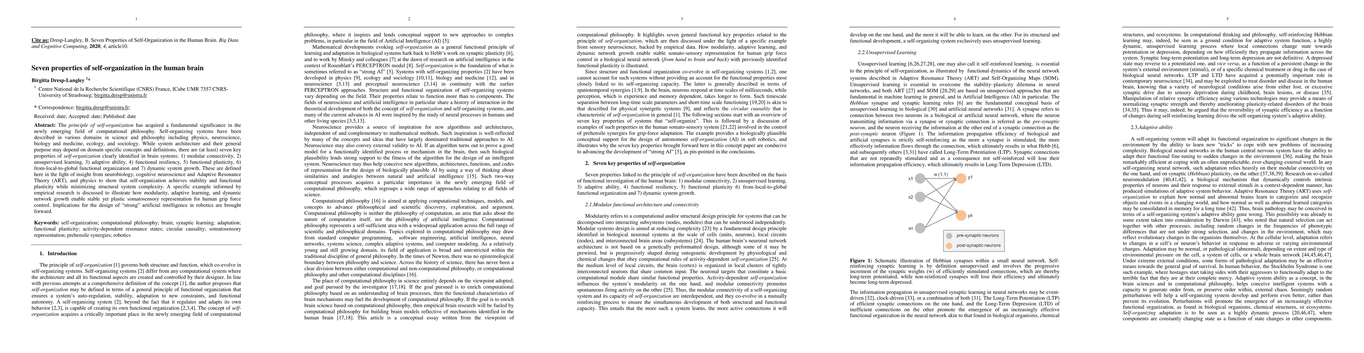 This paper identifies seven key properties of self-organization in the human brain: modular connectivity, unsupervised learning, adaptive ability, functional resiliency, functional plasticity, from-local-to-global functional organization, and dynamic system growth. It highlights how these properties enable stable yet flexible brain functions, illustrated through empirical research on grip force control, and discusses implications for artificial intelligence design.