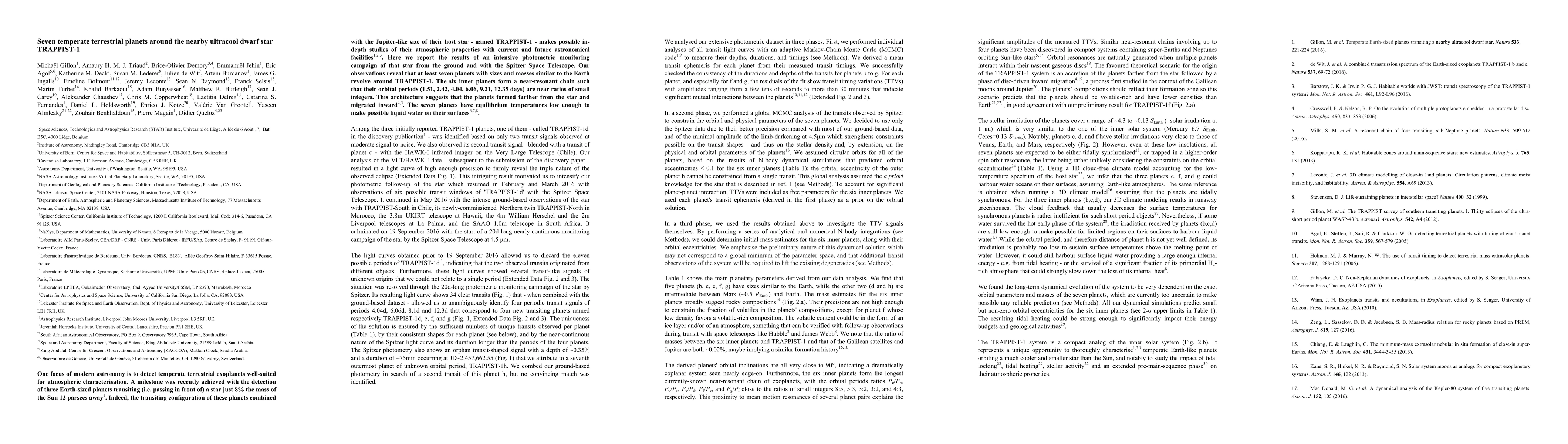 This paper reports the discovery of seven Earth-sized planets orbiting the ultracool dwarf star TRAPPIST-1, with six of them forming a near-resonant chain. These temperate terrestrial planets have potential for liquid water on their surfaces, making them prime targets for atmospheric studies.