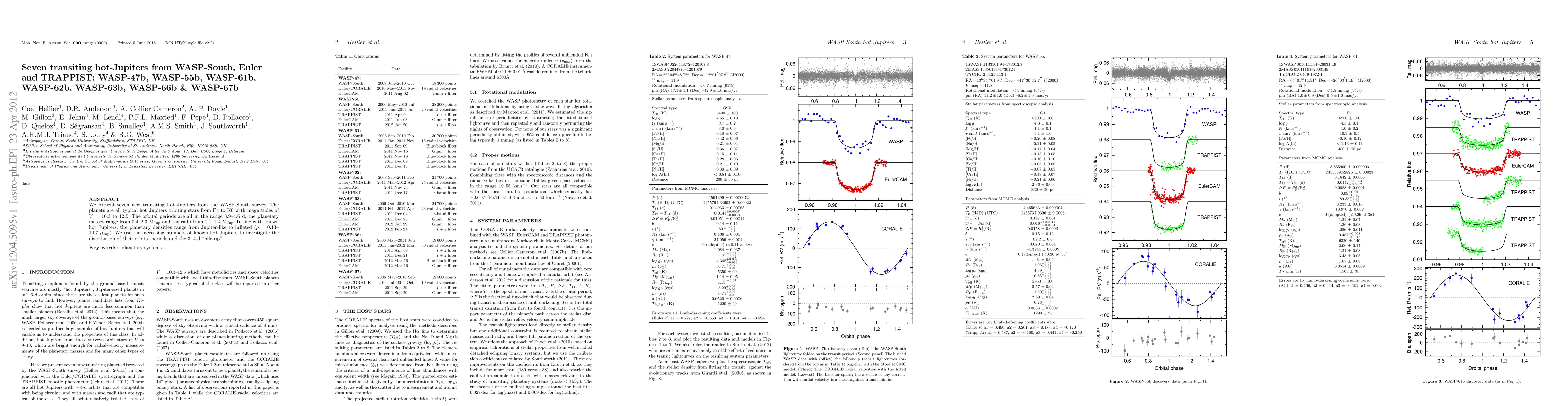 We present seven new transiting hot Jupiters from the WASP-South survey. The planets are all typical hot Jupiters orbiting stars from F4 to K0 with magnitudes of V = 10.3 to 12.5. The orbital periods are all in the range 3.9--4.6 d, the planetary masses range from 0.4--2.3 Mjup and the radii from 1.1--1.4 Mjup. In line with known hot Jupiters, the planetary densities range from Jupiter-like to inflated (rho = 0.13--1.07 rho_jup). We use the increasing numbers of known hot Jupiters to investigate the distribution of their orbital periods and the 3--4-d "pile-up".