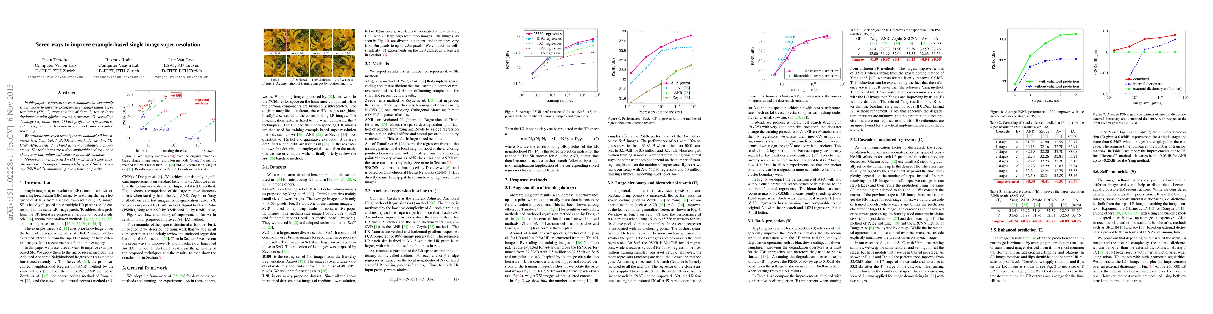In this paper we present seven techniques that everybody should know to improve example-based single image super resolution (SR): 1) augmentation of data, 2) use of large dictionaries with efficient search structures, 3) cascading, 4) image self-similarities, 5) back projection refinement, 6) enhanced prediction by consistency check, and 7) context reasoning. We validate our seven techniques on standard SR benchmarks (i.e. Set5, Set14, B100) and methods (i.e. A+, SRCNN, ANR, Zeyde, Yang) and achieve substantial improvements.The techniques are widely applicable and require no changes or only minor adjustments of the SR methods. Moreover, our Improved A+ (IA) method sets new state-of-the-art results outperforming A+ by up to 0.9dB on average PSNR whilst maintaining a low time complexity.