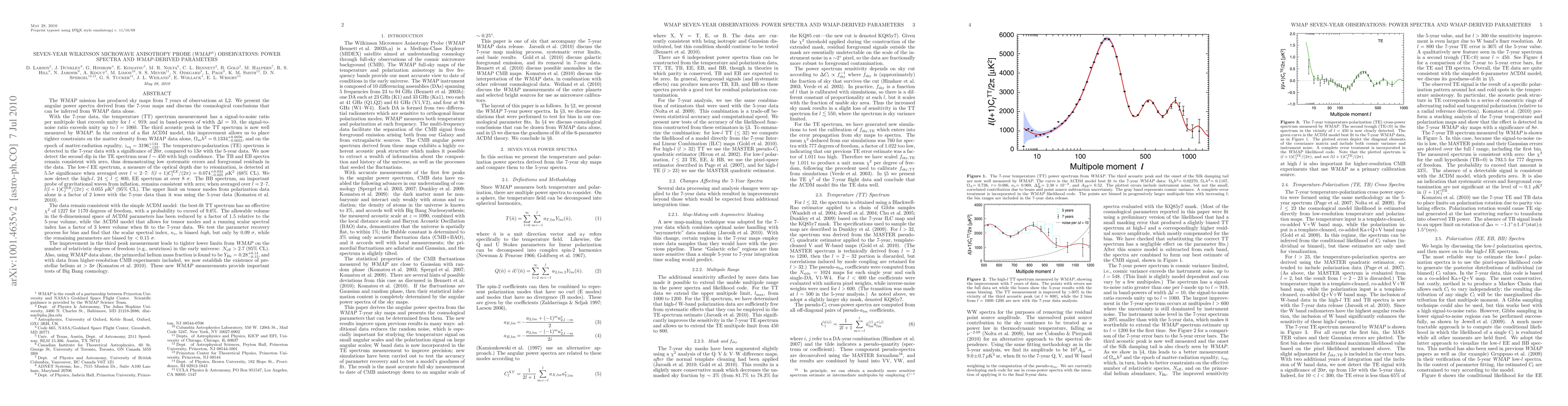 The seven-year Wilkinson Microwave Anisotropy Probe (WMAP) observations provide refined angular power spectra, leading to tighter constraints on cosmological parameters, including matter density and the epoch of matter-radiation equality. The temperature-polarization spectrum is detected with higher significance, and the primordial helium mass fraction is established with greater confidence.