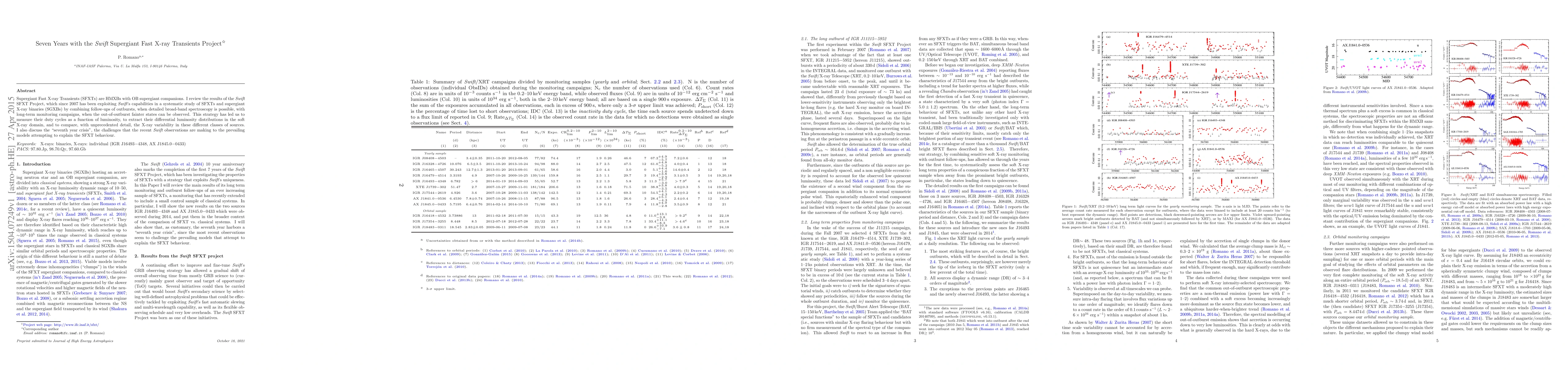 Supergiant Fast X-ray Transients (SFXTs) are HMXBs with OB supergiant companions. I review the results of the Swift SFXT Project, which since 2007 has been exploiting Swift's capabilities in a systematic study of SFXTs and supergiant X-ray binaries (SGXBs) by combining follow-ups of outbursts, when detailed broad-band spectroscopy is possible, with long-term monitoring campaigns, when the out-of-outburst fainter states can be observed. This strategy has led us to measure their duty cycles as a function of luminosity, to extract their differential luminosity distributions in the soft X-ray domain, and to compare, with unprecedented detail, the X-ray variability in these different classes of sources. I also discuss the "seventh year crisis", the challenges that the recent Swift observations are making to the prevailing models attempting to explain the SFXT behaviour.