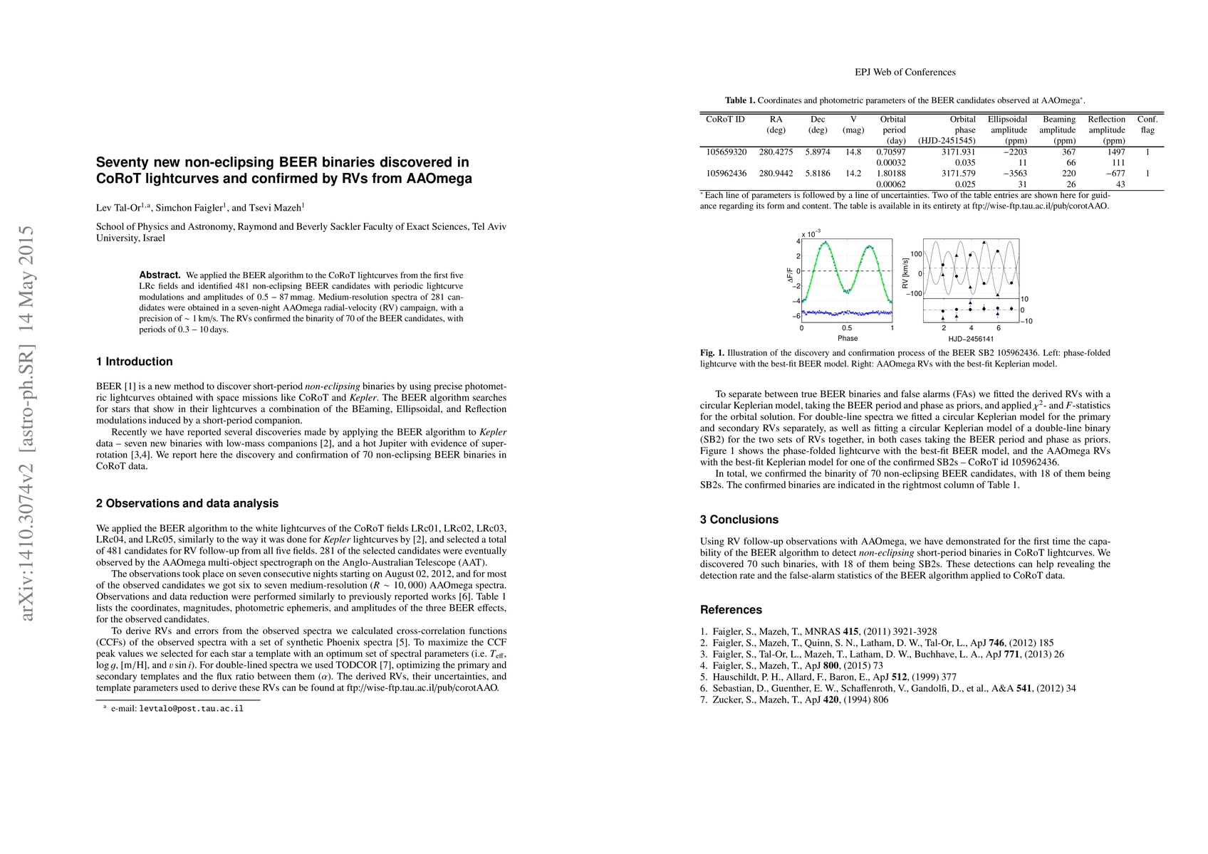 Summary: The BEER algorithm identified 481 non-eclipsing binary candidates from CoRoT lightcurves, and radial-velocity observations from an AAOmega campaign confirmed the binarity of 70 of these candidates, revealing new non-eclipsing binary systems with periods ranging from 0.3 to 10 days.