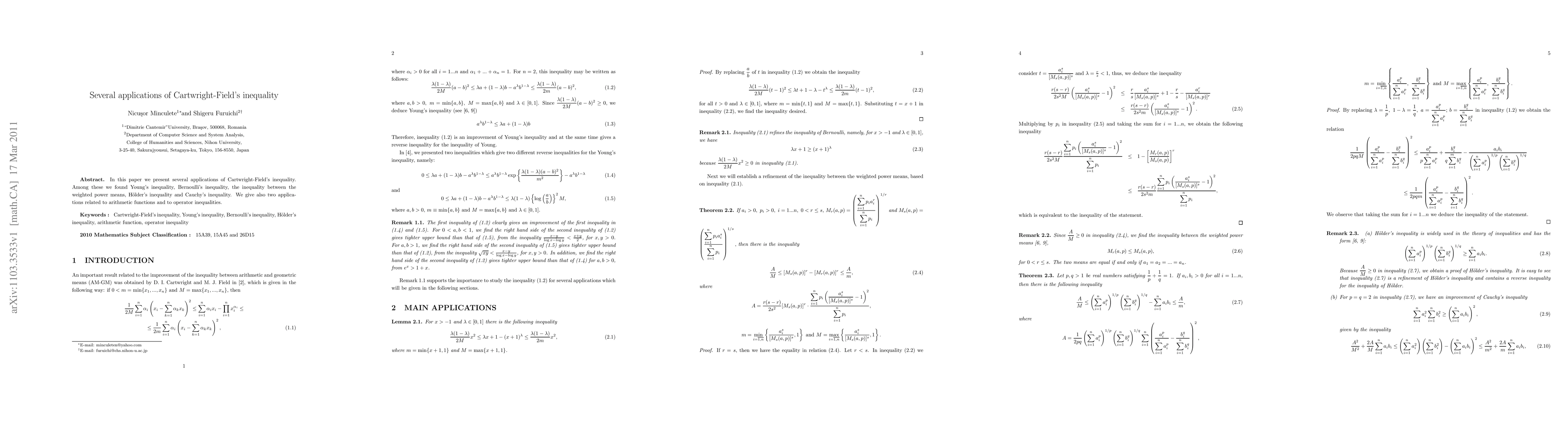 In this paper we present several applications of Cartwright-Field's inequality. Among these we found Young's inequality, Bernoulli's inequality, the inequality between the weighted power means, H\"{o}lder's inequality and Cauchy's inequality. We give also two applications related to arithmetic functions and to operator inequalities.