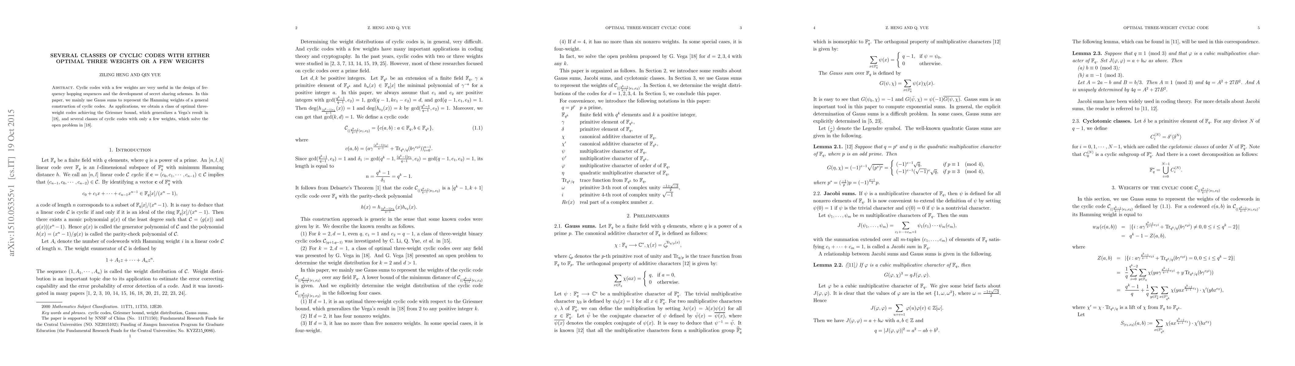 This paper constructs cyclic codes using Gauss sums to determine their Hamming weights, resulting in optimal three-weight codes achieving the Griesmer bound and several classes of cyclic codes with few weights, addressing an open problem and extending Vega's prior work.