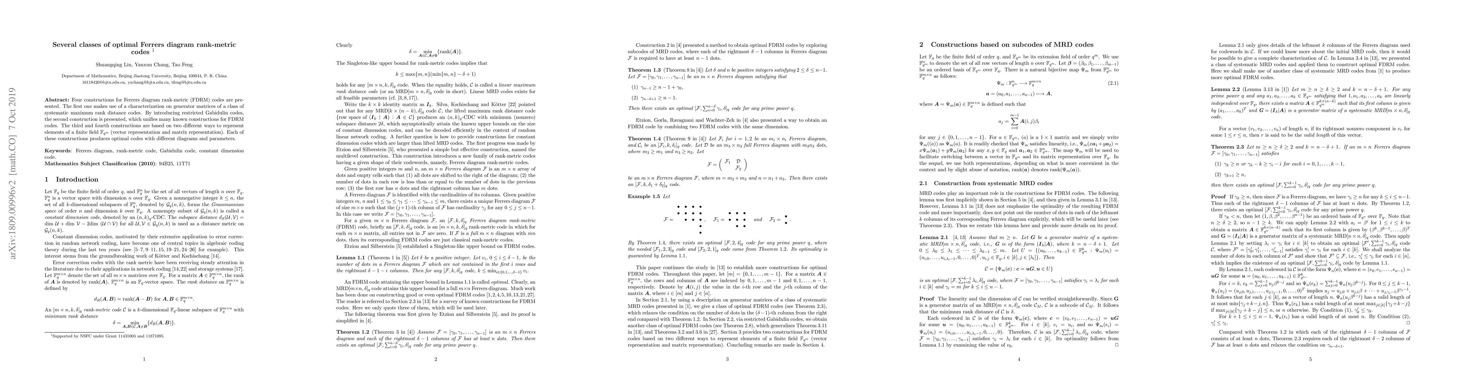 This paper presents four constructions for Ferrers diagram rank-metric codes, utilizing systematic maximum rank distance codes, restricted Gabidulin codes, and two distinct representations of finite field elements to produce optimal codes with varying diagrams and parameters.
